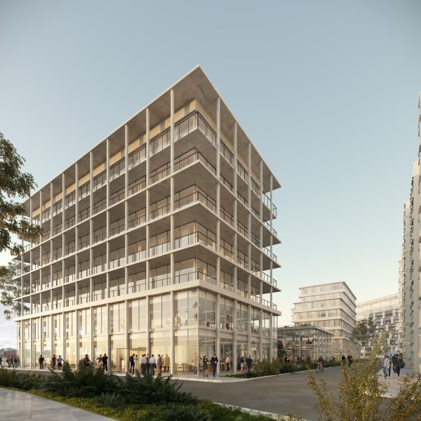 Du parking en sous-sol et jusqu’à R+3, la structure est un principe de poteaux-poutres en béton. À partir du R+4, sur trois niveaux, l’ossature des façades est en 𝐛𝐨𝐢𝐬. L’opération intègre des 𝐦𝐚𝐭𝐞́𝐫𝐢𝐚𝐮𝐱 𝐛𝐢𝐨𝐬𝐨𝐮𝐫𝐜𝐞́𝐬 à différentes échelles dans le bâti : Structure, choix des menuiseries bois/alu et revêtements de sols. L’objectif visé est la validation du label Energétique Effinergie E+C- . Enfin, La production de chaud et de froid est assuré à l’aide de la 𝐠𝐞́𝐨𝐭𝐡𝐞𝐫𝐦𝐢𝐞 à l’échelle du lot.
