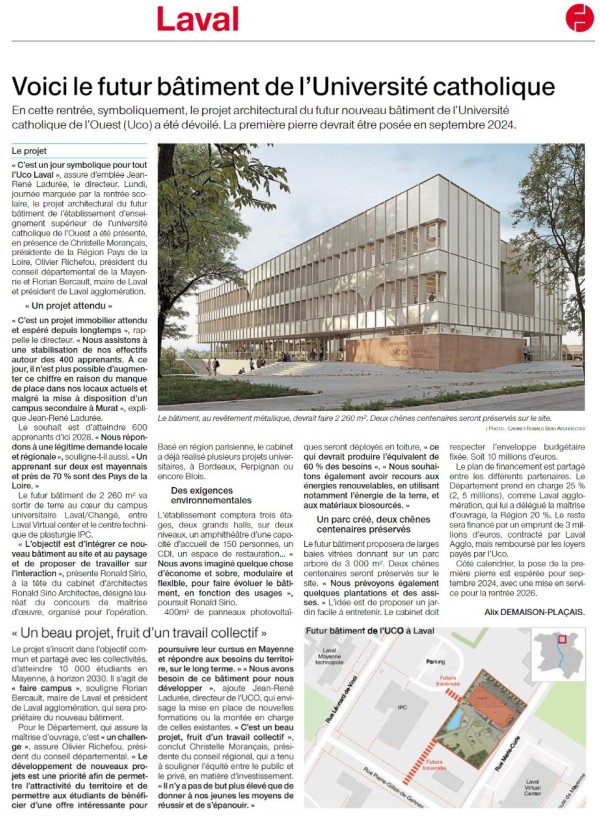 Le futur bâtiment de l’Université catholique de l’Ouest est dévoilé cette semaine dans Ouest France :