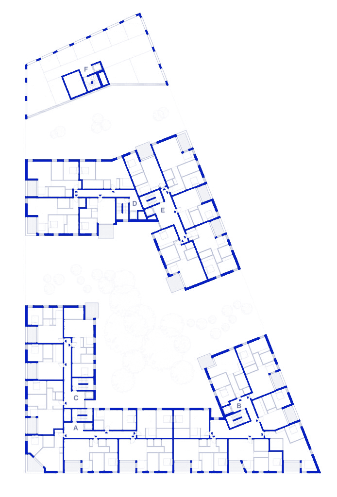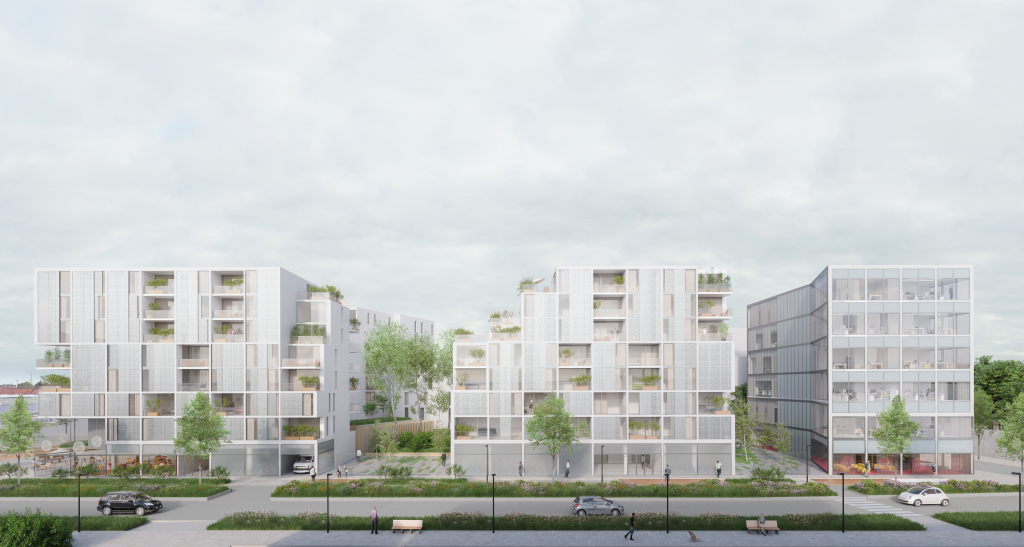 L’îlot F2 témoigne des ambitions du projet urbain. Il se compose de deux bâtiments de logements en R+7 et R+4 et d’un bâtiment de bureaux en R+6. Des failles toute hauteur fragmentent le rythme du bâti. Elles créent des percées visuelles et rendent l’îlot perméable à son environnement proche. Le projet s’ouvre ainsi à la ville dans un dialogue végétal entre les espaces privés et les espaces publics. Les bâtiments sont habillés de bardages en cassettes métalliques dont certaines sont mobiles et constituent des volets.
