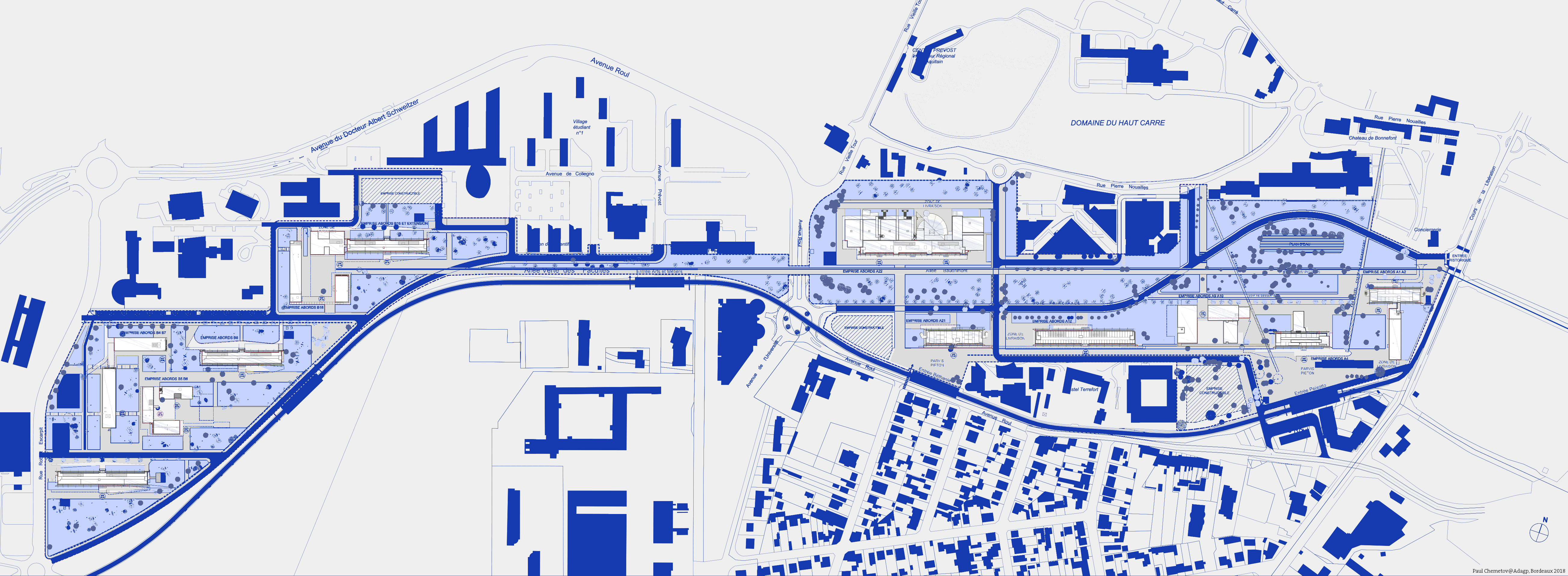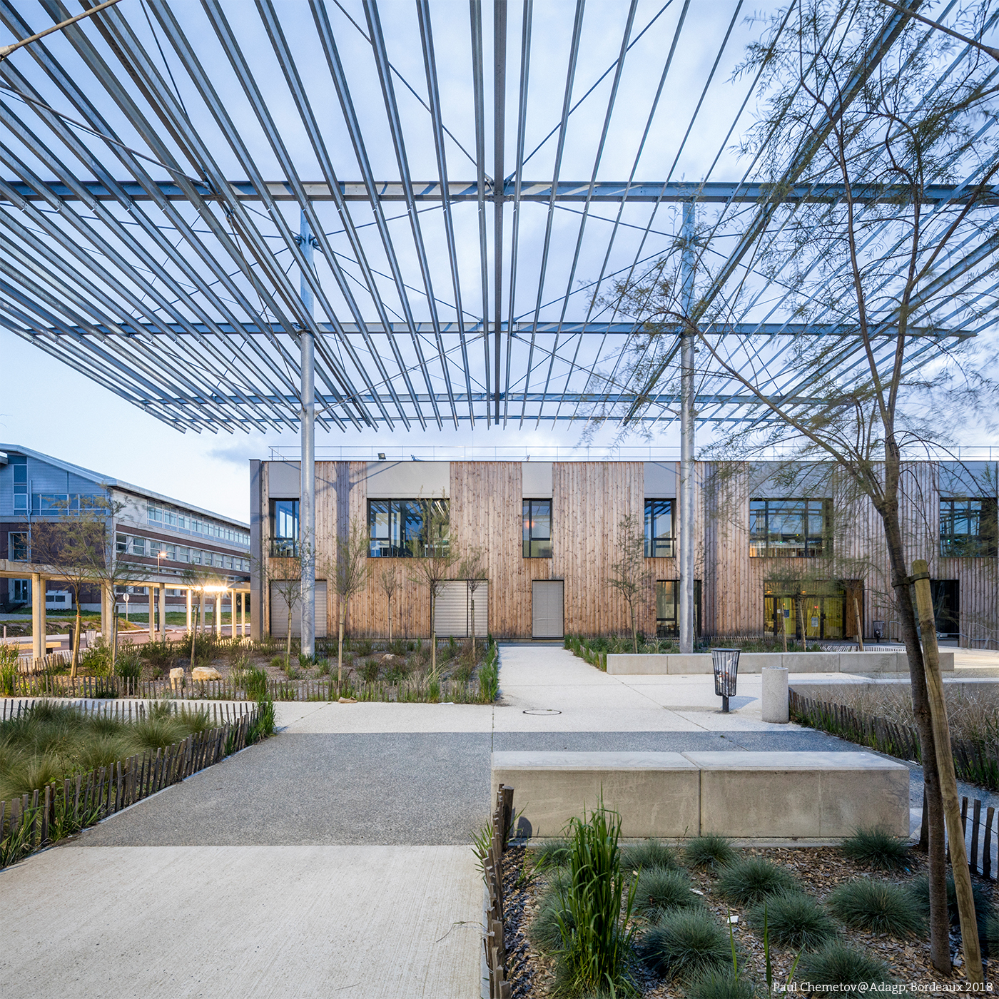 Le campus conçu par René Coulon en 1953 a été profondément remanié pour mieux se connecter à la ville contemporaine, repenser son organisation générale et rénover certains bâtiments. La place des amphithéâtres, carré de 30 x 30 mètres était un lieu de transit sans qualité. Elle a été transformée en antichambre, un lieu où l’on se sent accueilli. Les façades ont été transformées, quelquefois en se dotant de structures en avant plan. Elles remodèlent les proportions de la place et mettent les bâtiments en relation.