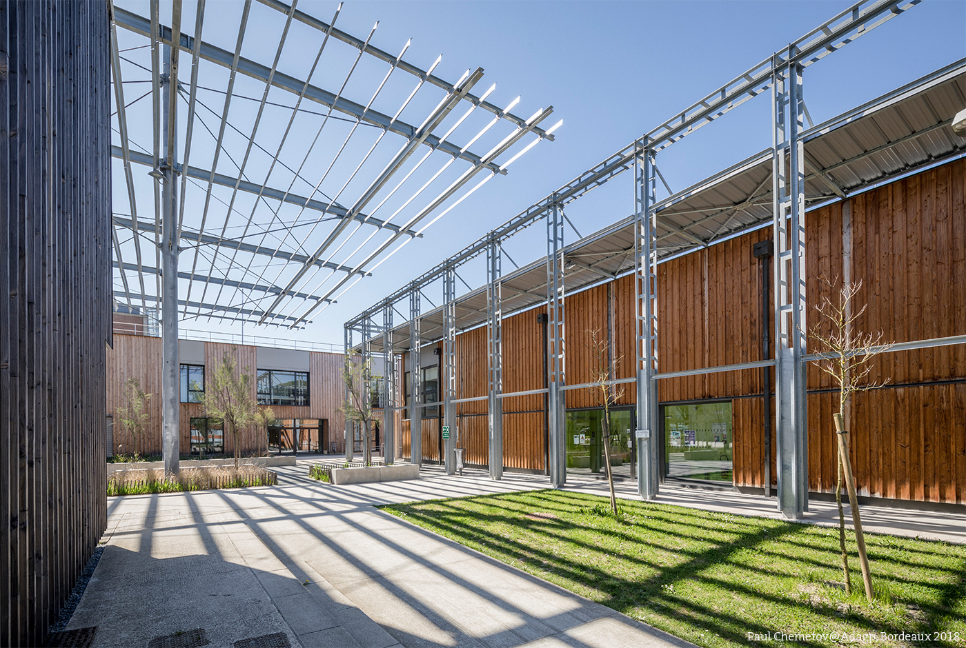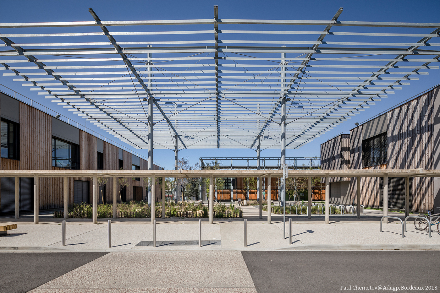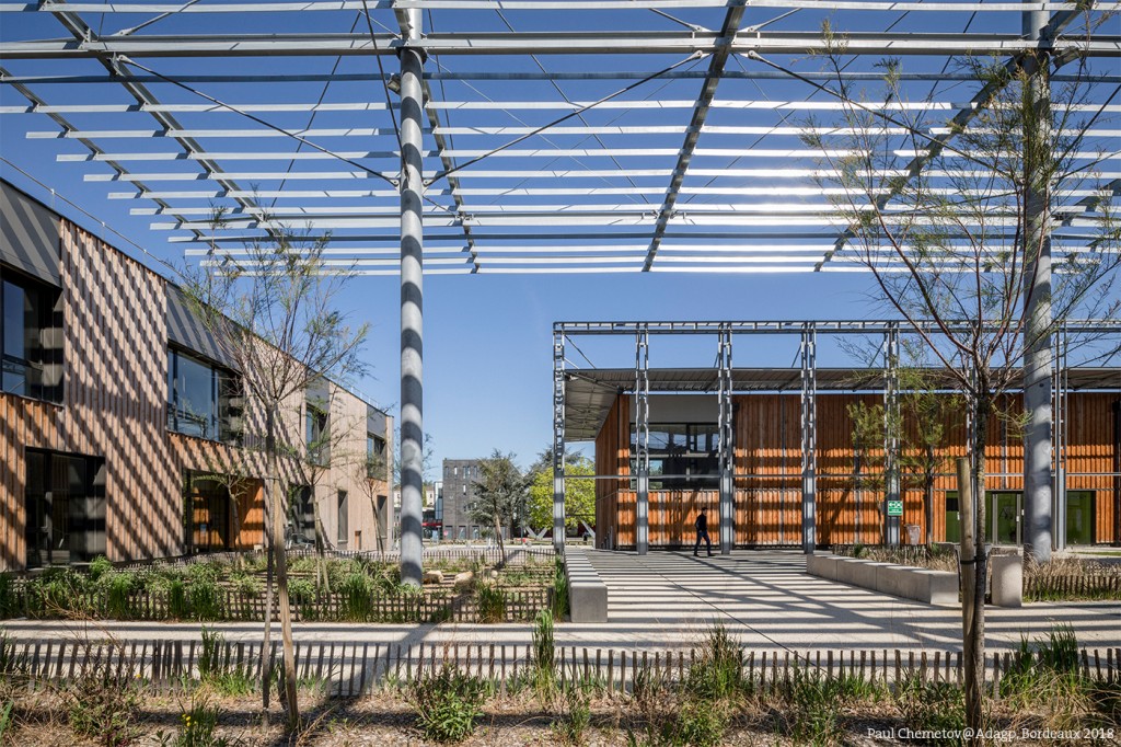 L’implantation d’une ombrière sur l’une des façades, à 10 mètres de hauteur, crée un effet de plafond qui confère à cet espace extérieur un sentiment d’intériorité, de salon urbain. La pluralité des matériaux enrichit sensoriellement le lieu : la structure et les ventelles de l’ombrière sont en acier ; certaines façades sont habillées de bois ; le sol est une plaque de béton continu dans laquelle ont été ménagées des réservations pour implanter des bandes de béton désactivé ; les assises sont des volumes en béton. La végétation qui se développe dans des bandes de pleine terre participe du nouveau rapport d’échelle et de sa sensualité.