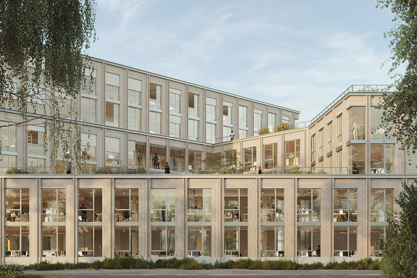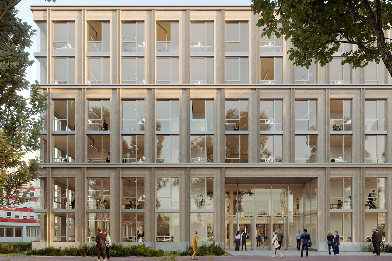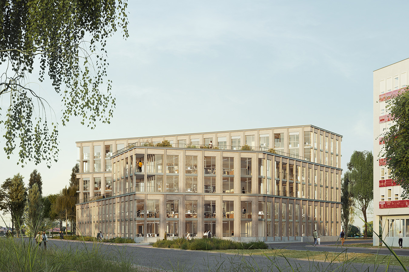 L’opération se situe le long de l’axe historique reliant Lille à Tourcoing, qui s’est urbanisé de manière très hétérogène tout au long du XXe siècle. Elle est implantée en retrait par rapport aux limites parcellaires afin de tisser de la cohésion urbaine, ménager des perspectives visuelles et conserver les arbres existants. Elle s’attache également à recoudre les échelles en présence en reprenant les différentes volumétries environnantes, de R+1 à R+5, par un principe de volumes posés les uns sur les autres. Ce dispositif permet de mettre en place un patio central et un éclairement naturel de grande qualité dans la profondeur du bâti. L’infrastructure est en béton armée, la superstructure à partir du R+1 en bois lamellé-collé. La hauteur sous plafond limitée à 3,30 mètres et l’implantation des gaines techniques permet d’envisager facilement la transformation des plateaux libres en logements. L’opération vise l’obtention des labels les plus exigeants et l’inscription dans l’économie circulaire.