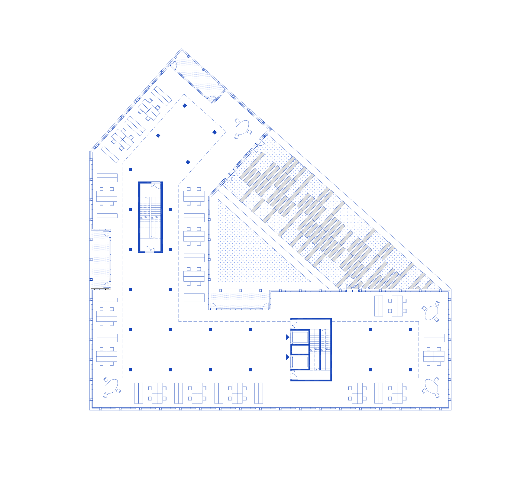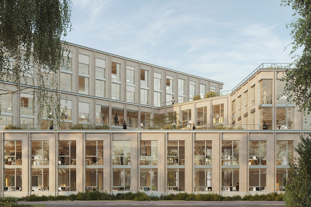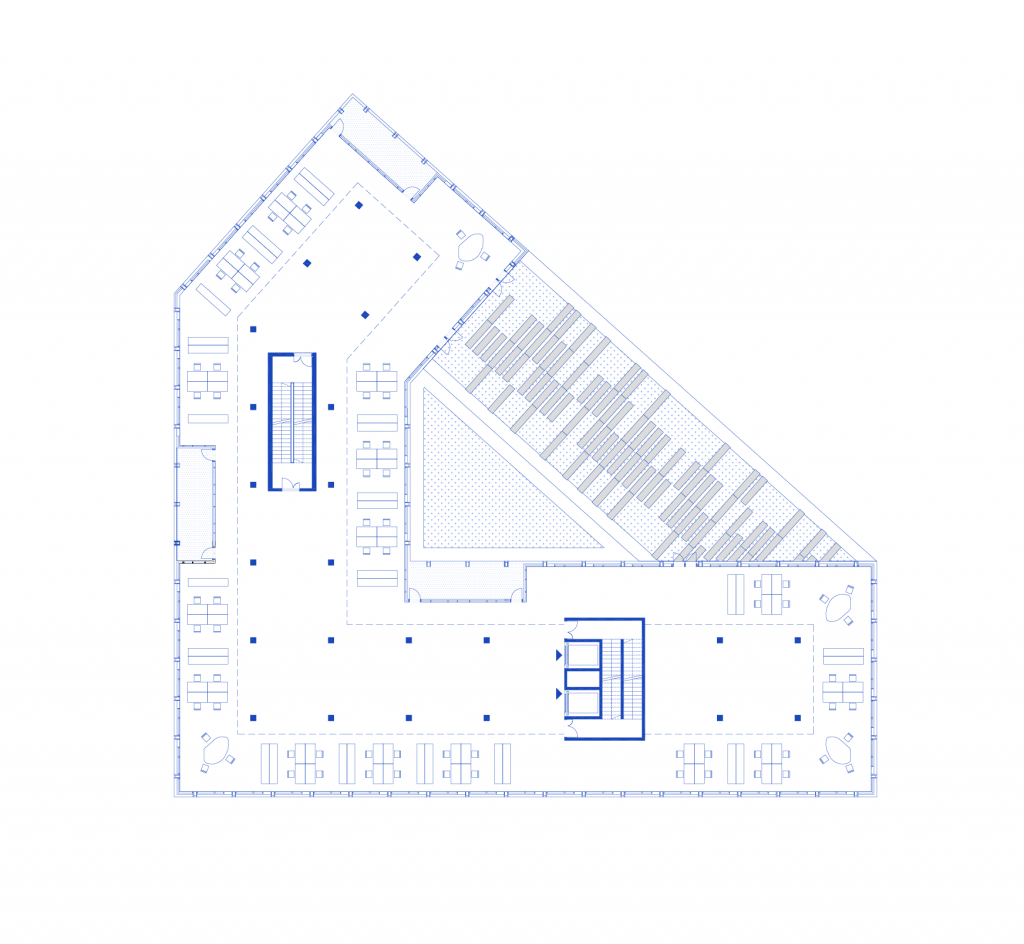 L’opération se situe le long de l’axe historique reliant Lille à Tourcoing, qui s’est urbanisé de manière très hétérogène tout au long du XXe siècle. Elle est implantée en retrait par rapport aux limites parcellaires afin de tisser de la cohésion urbaine, ménager des perspectives visuelles et conserver les arbres existants. Elle s’attache également à recoudre les échelles en présence en reprenant les différentes volumétries environnantes, de R+1 à R+5, par un principe de volumes posés les uns sur les autres. Ce dispositif permet de mettre en place un patio central et un éclairement naturel de grande qualité dans la profondeur du bâti. L’infrastructure est en béton armée, la superstructure à partir du R+1 en bois lamellé-collé. La hauteur sous plafond limitée à 3,30 mètres et l’implantation des gaines techniques permet d’envisager facilement la transformation des plateaux libres en logements. L’opération vise l’obtention des labels les plus exigeants et l’inscription dans l’économie circulaire.