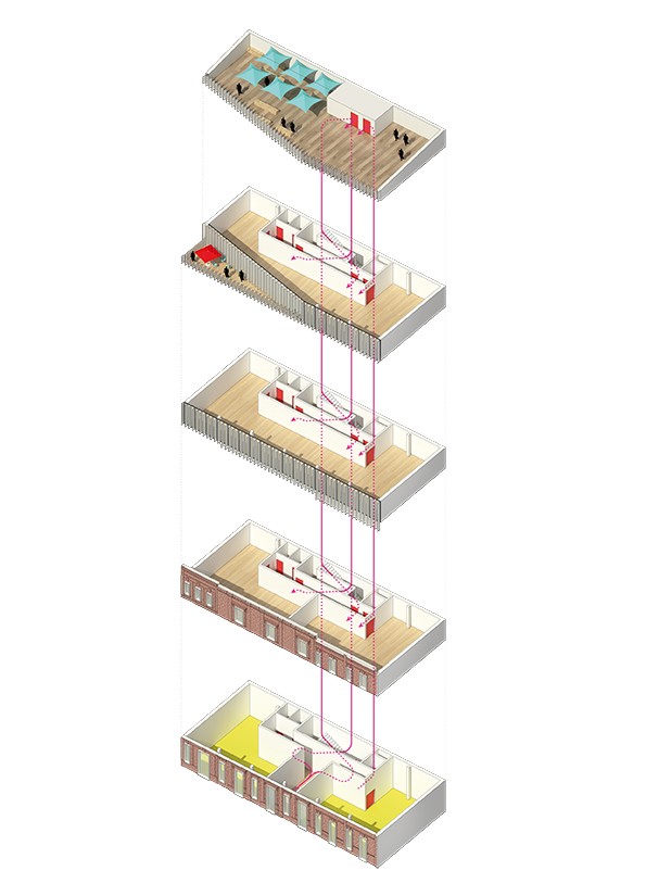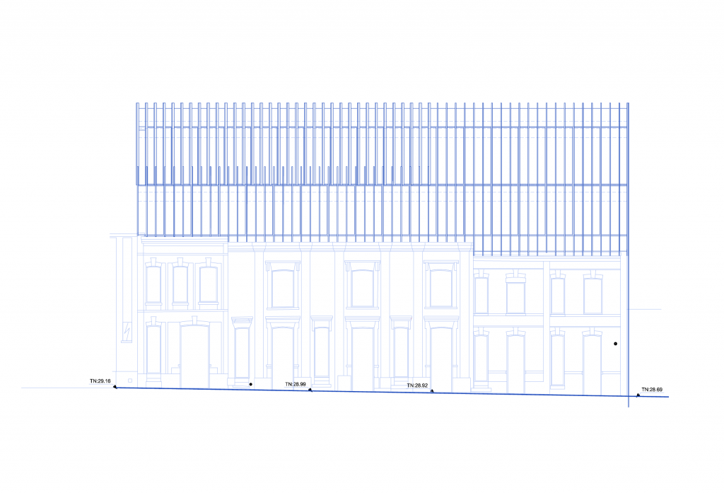 Nous proposons un projet qui marque le passage d’une somme d’individualités à un tout unitaire : d’un programme composé de plusieurs singularités (6 maisons habitées par des familles distinctes) que l’on distingue par le rythme des avancées de façade en brique et des ouvertures, on se tourne aujourd’hui vers un programme collectif (bureaux dans lesquels on travaille ensemble, à plusieurs). Ce nouveau bâtiment en R+2+1 attique constitué des façades existantes des amiénoises en brique surélevées par deux niveaux vitrés allie conservation d’éléments patrimoniaux de la ville et une architecture contemporaine, restituant une pièce urbaine à l’échelle du quartier : le rapport au sol fractionné en 6 entités laisse place à un édifice unique intégré à la ville et au paysage lointain.