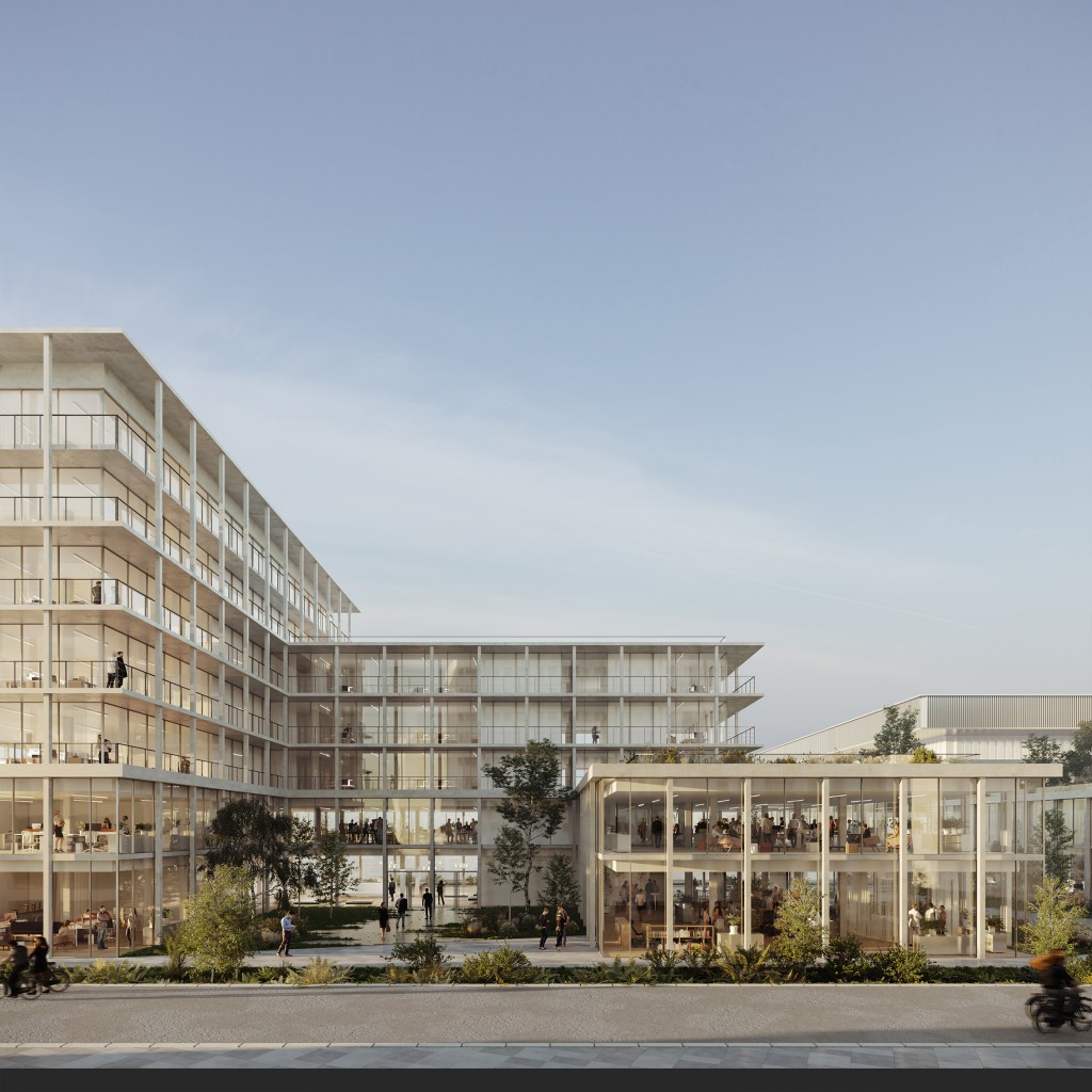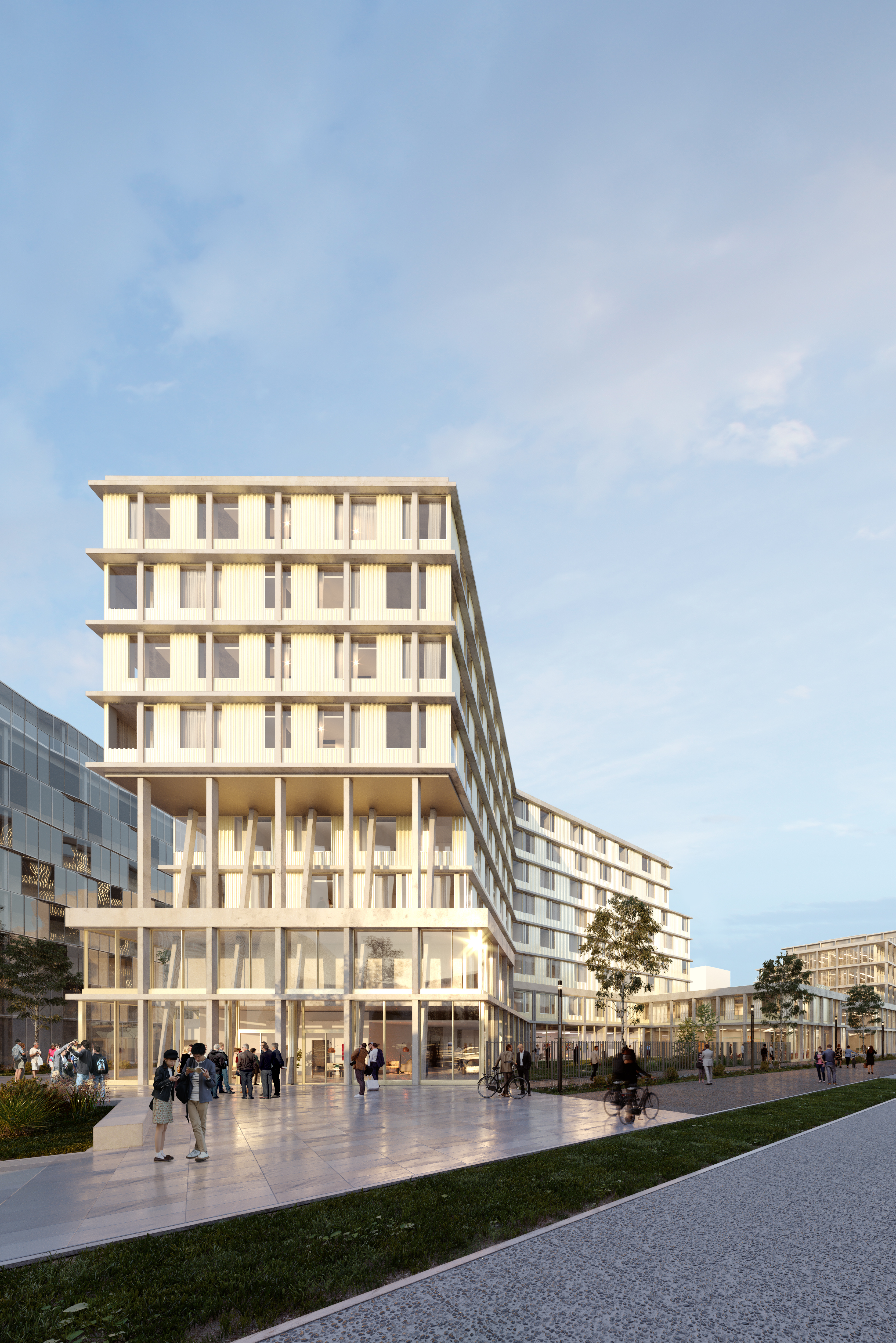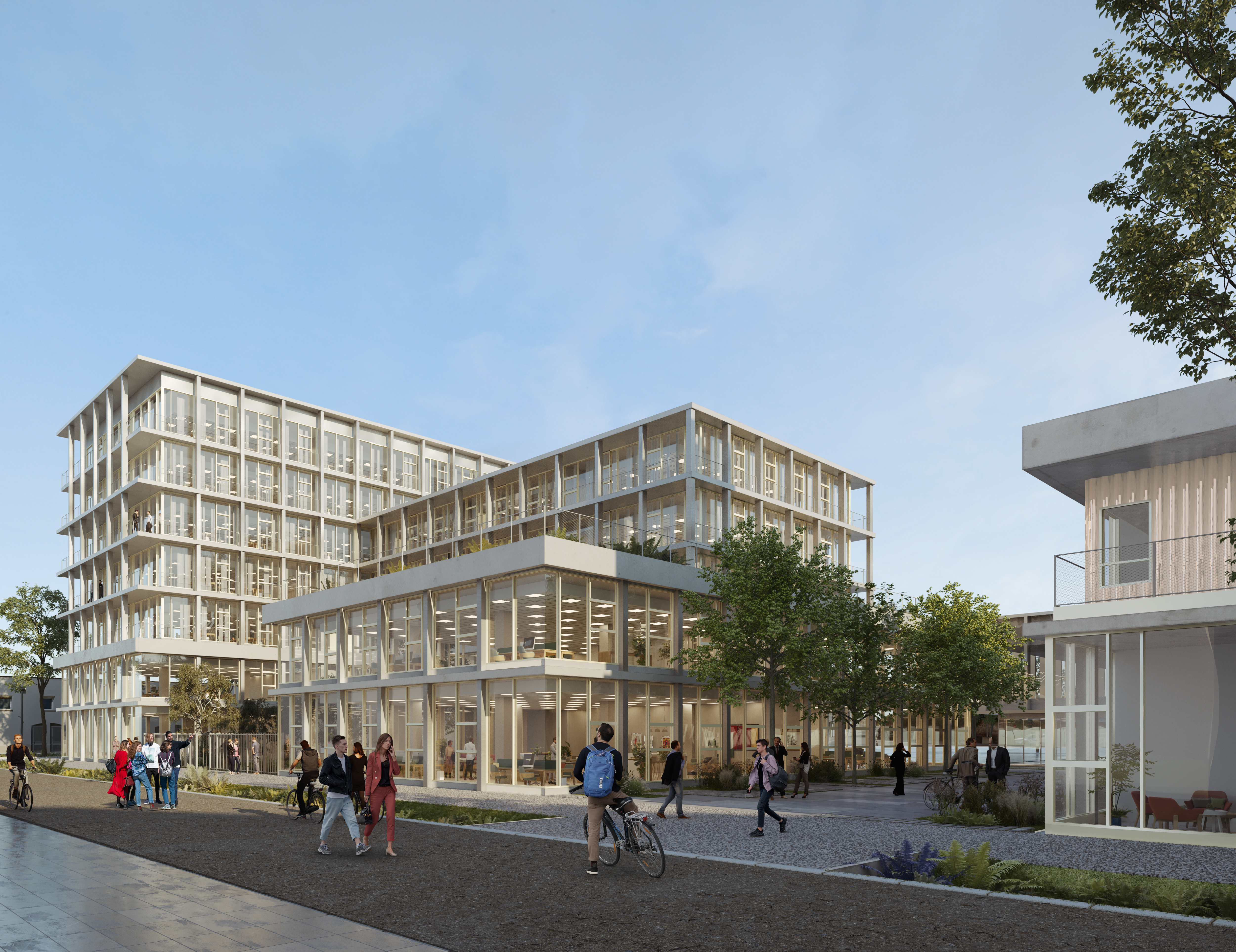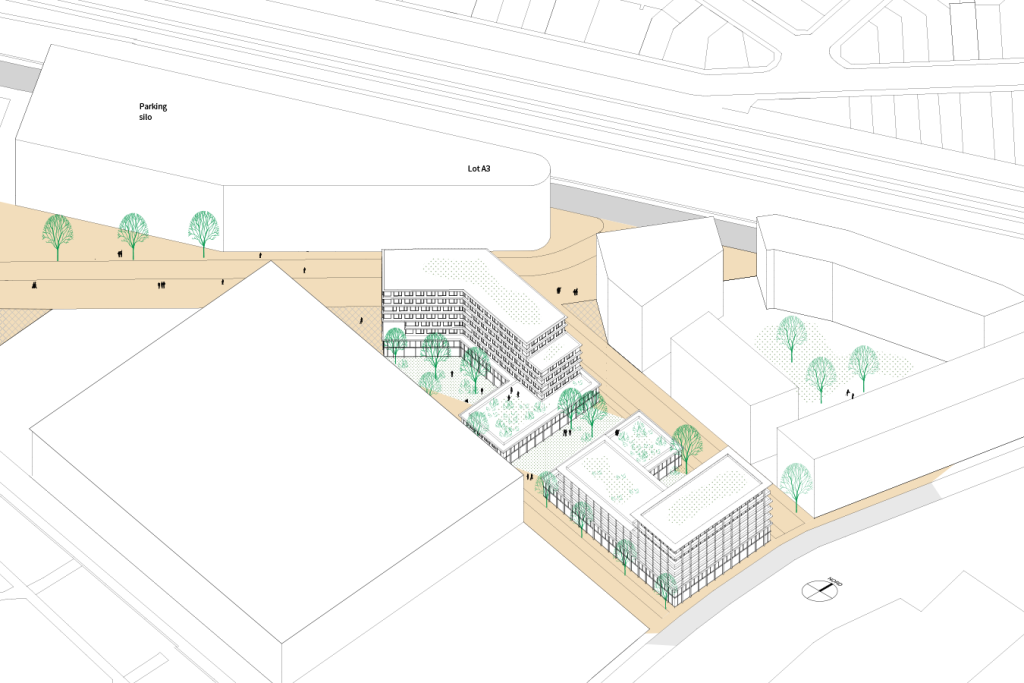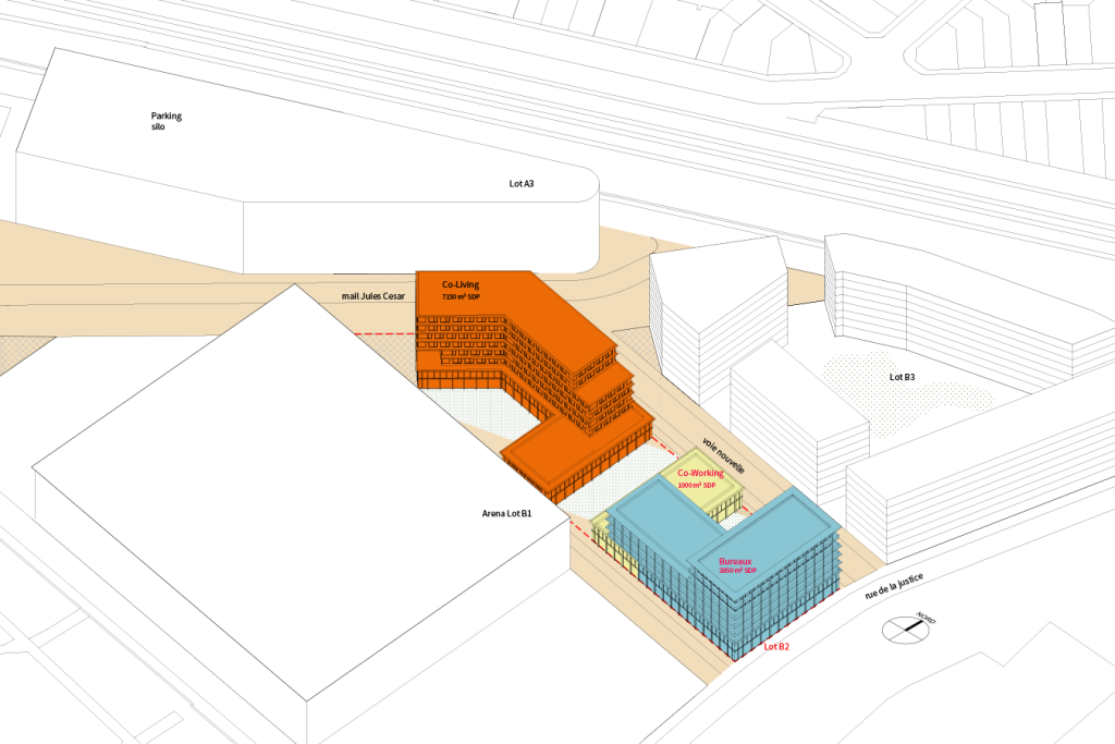 Le nouveau quartier se construit sur des friches ferroviaires et l’opération vient après la construction de deux grands équipements de loisir. La morphologie et la volumétrie des bâtiments participent alors pleinement à la redéfinition urbaine et à la couture des échelles en présence. Les lots B2 et B3 créent du tissu urbain. Ces immeubles accueillent une programmation innovante en lien avec la proximité de la gare : tertiaire dont une partie en coworking ; coliving et salles de sport pour le B2 et le B3. Le principe structurel permet d’envisager facilement la mutation de ces espaces. Le système constructif en poteau-dalle constitue des plateaux libres que l’on peut partitionner en fonction des demandes. L’implantation judicieuse des gaines techniques et une hauteur sous plafond de 3,30 mètres autorisent la reconversion en logements.