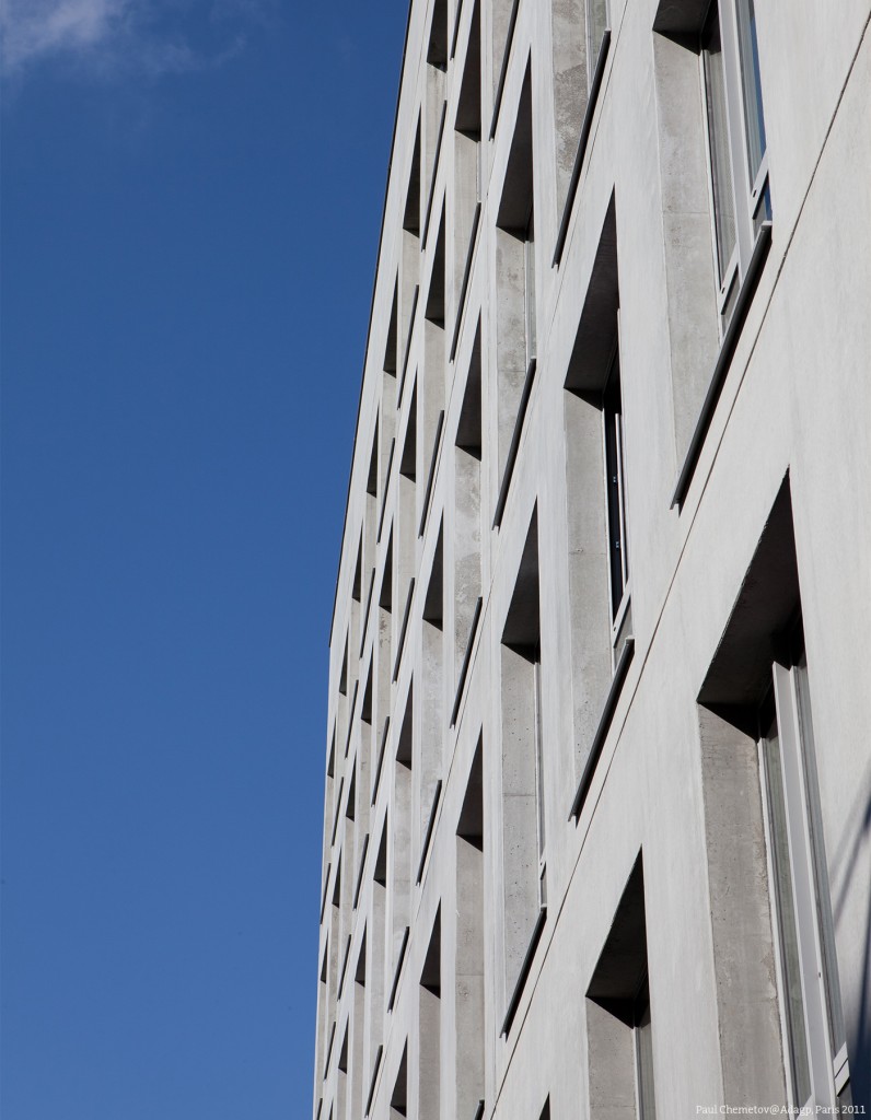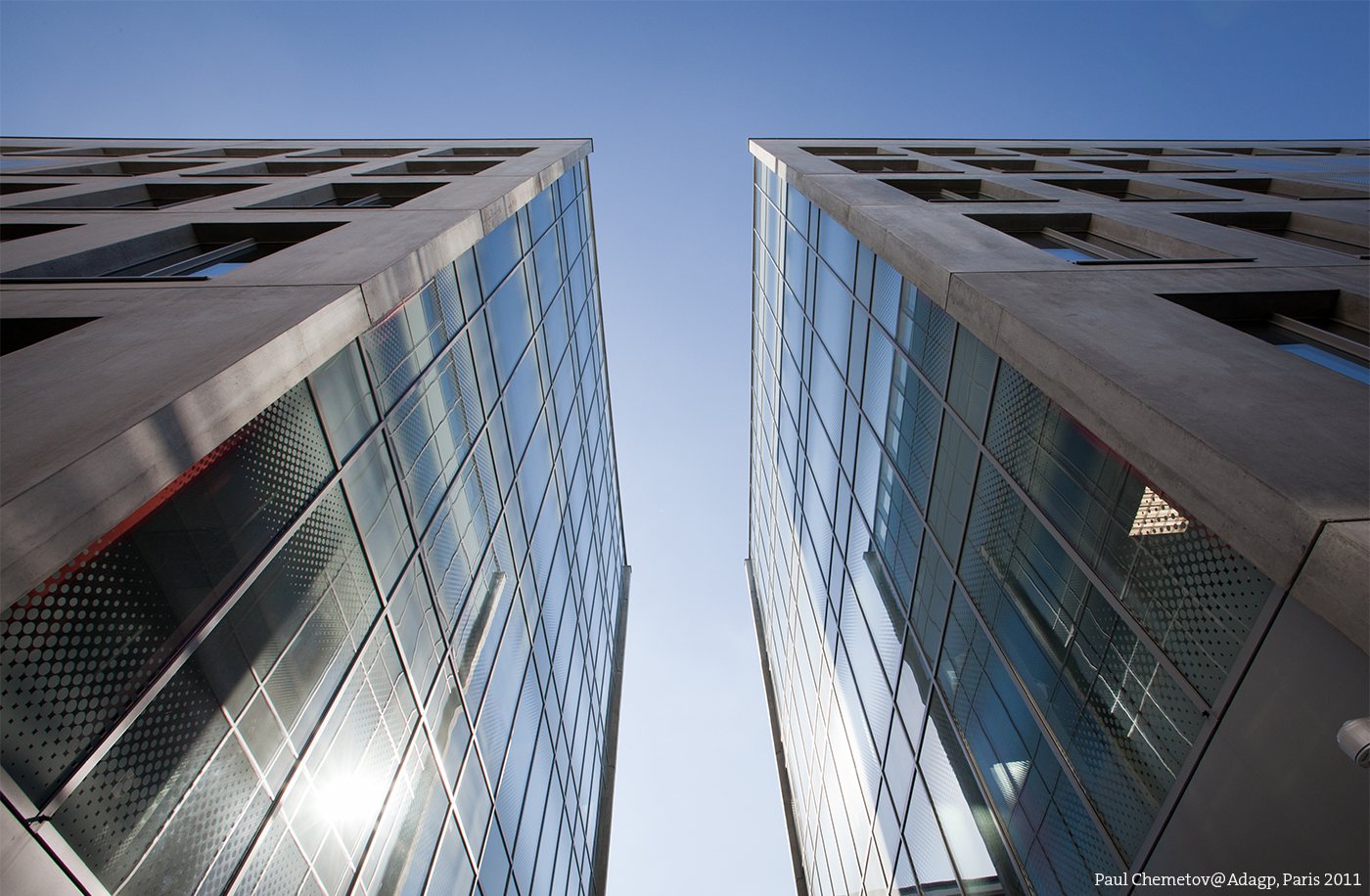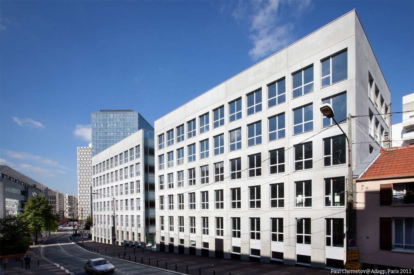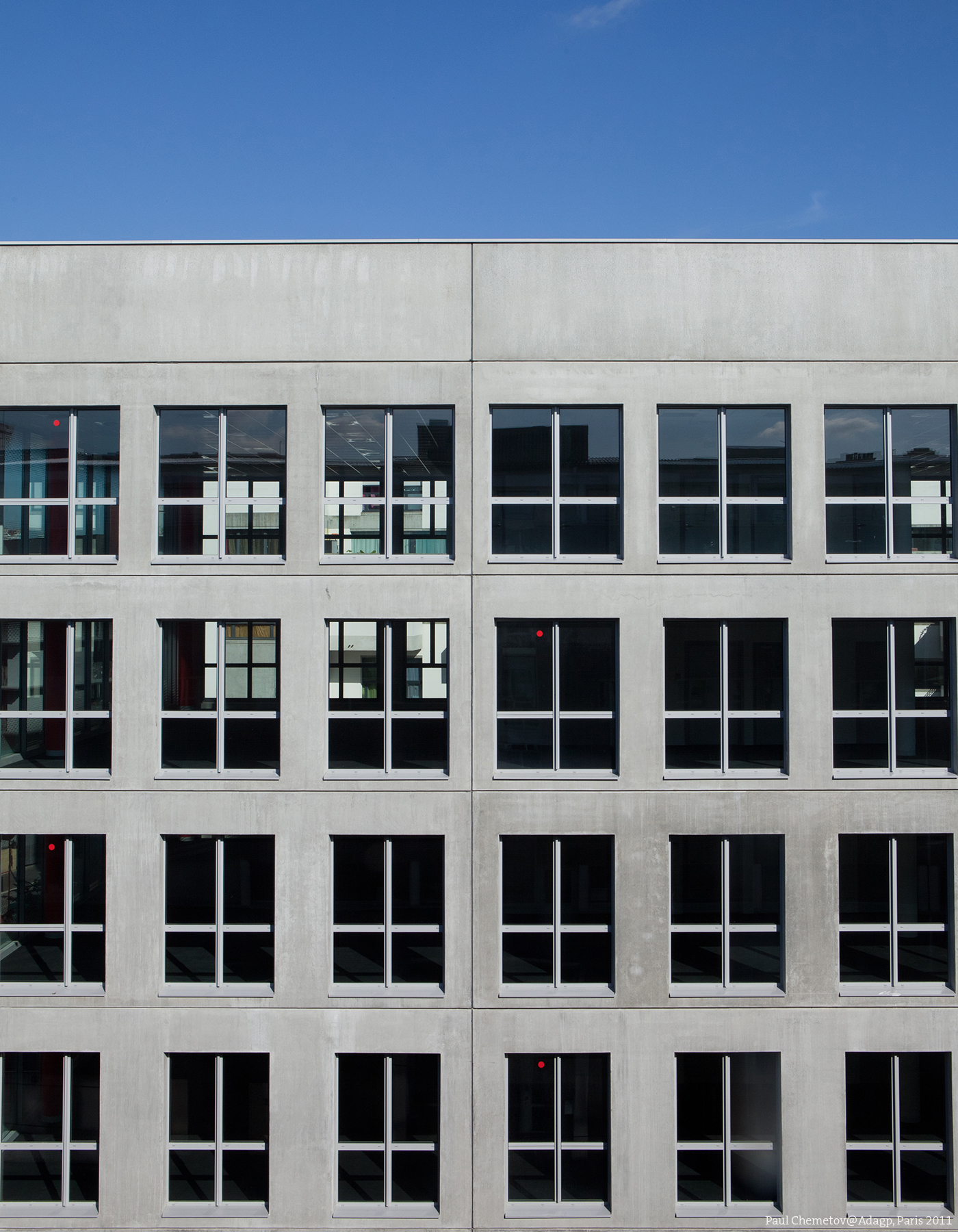 Ces deux bâtiments jumeaux de bureaux se situent à proximité de la mairie de Montreuil, dans la ZAC aux règles atypiques conçue par Àlvaro Siza. Ils paraissent au premier abord d’une grande sobriété : des façades de type grille en béton préfabriqué, conservé dans sa teinte naturelle, de grandes fenêtres. Cependant, un évasement des percements, de 7 centimètres à chaque étage, introduit une dynamique inattendue. Ce principe se retrouve également au niveau des poteaux : le principe est d’ôter de la matière dans les parties pleines en progressant vers le ciel – ce qui permet d’agrandir la partie vitrée.