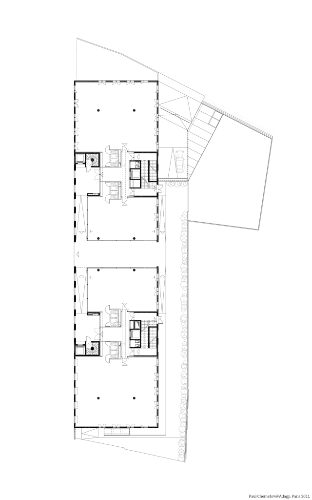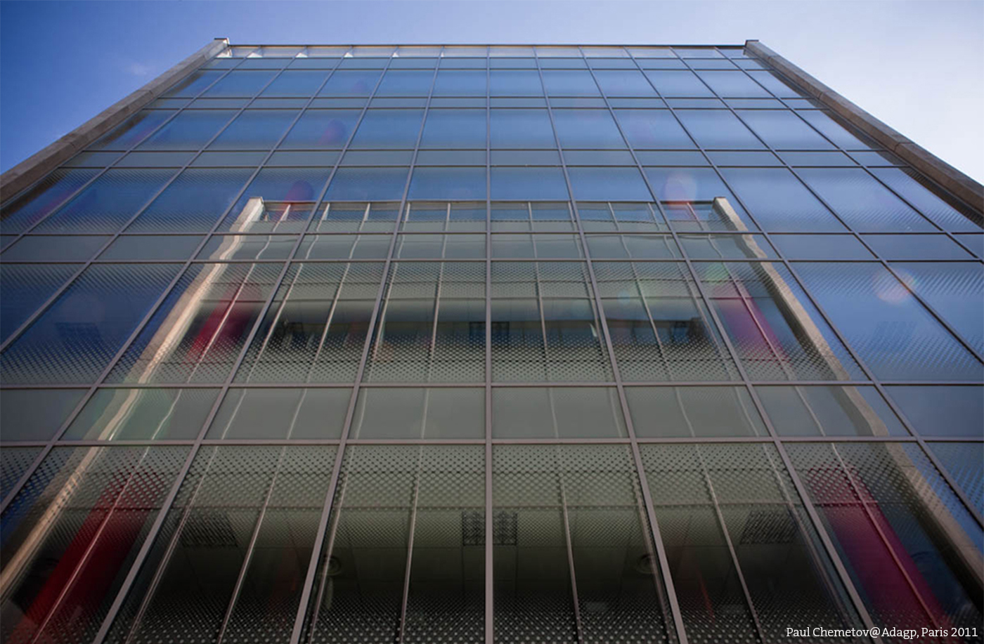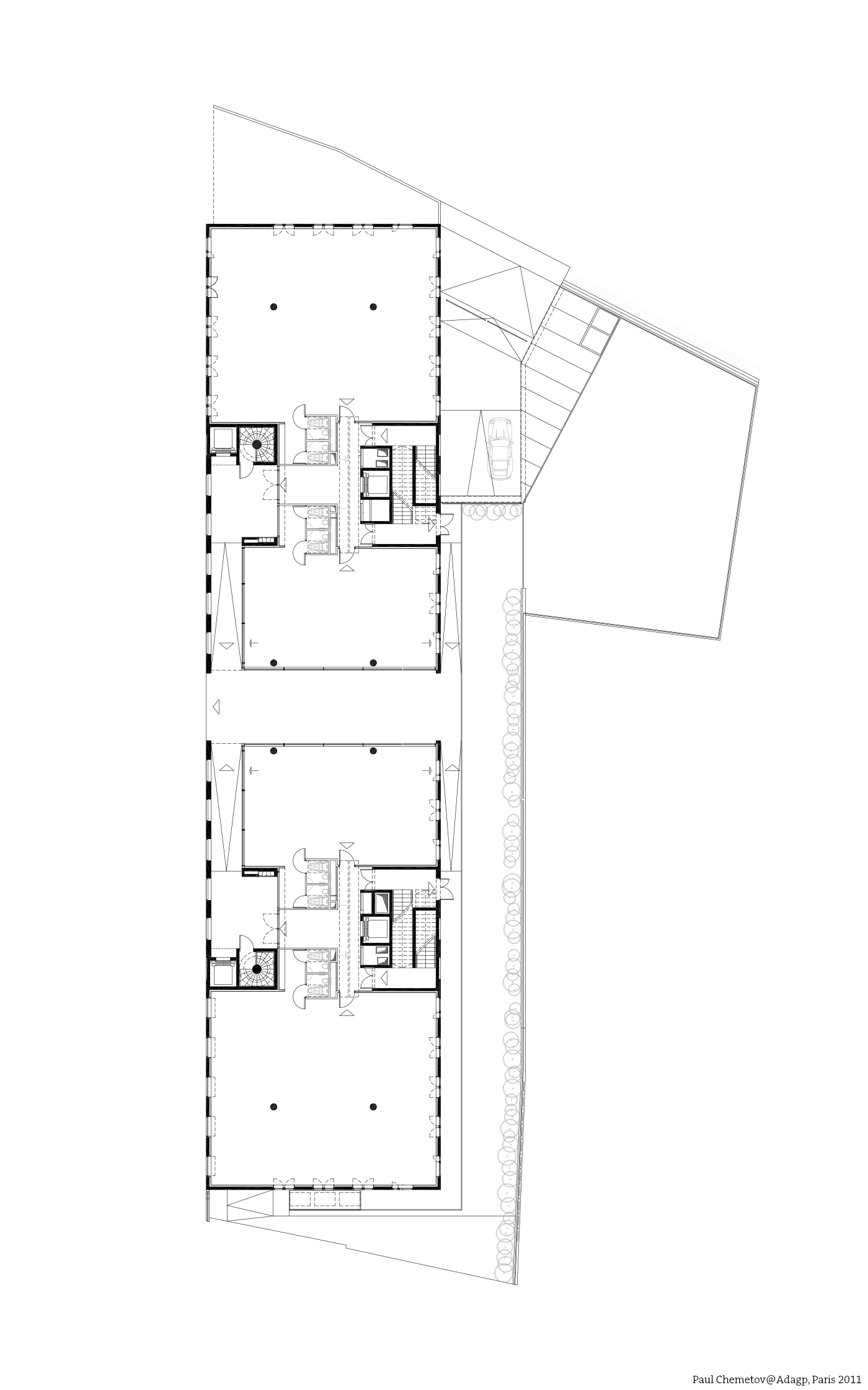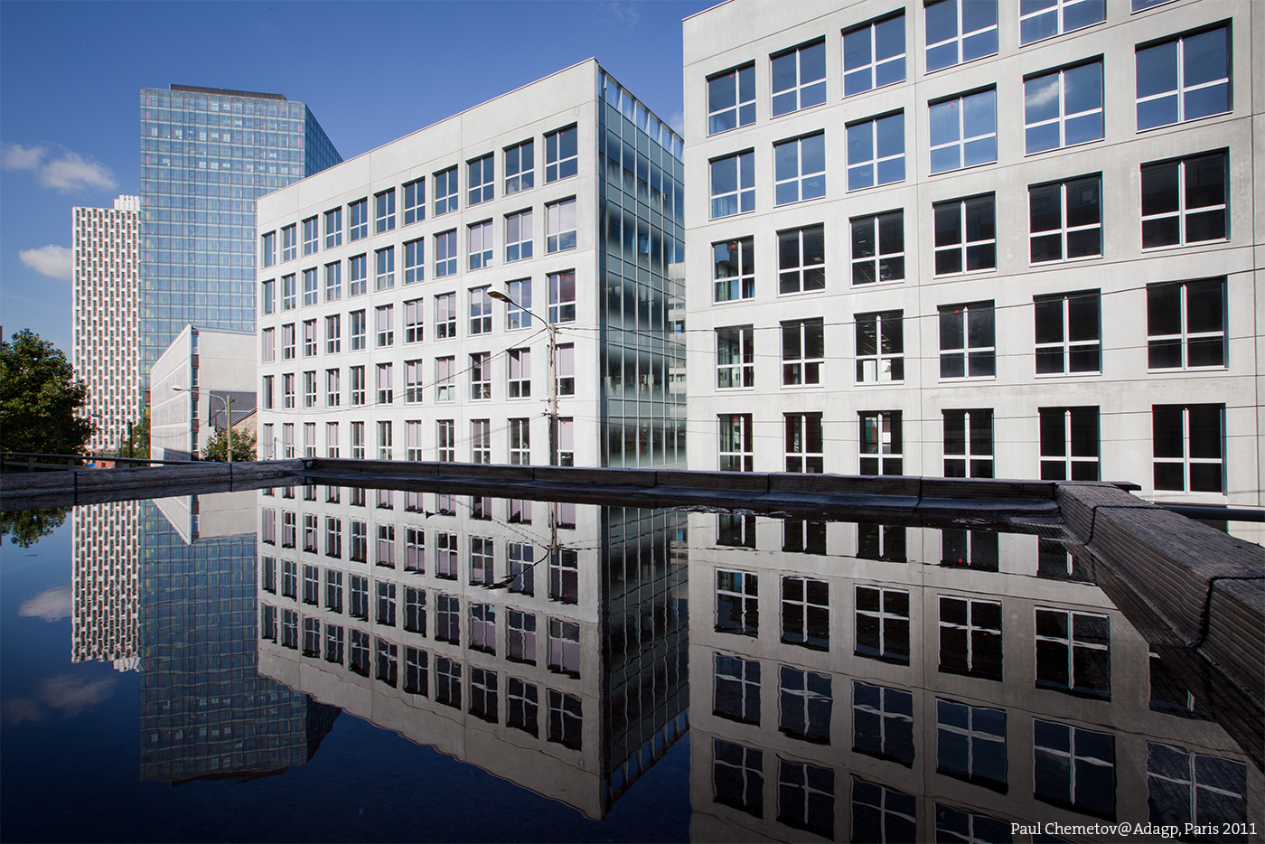Ces deux bâtiments jumeaux de bureaux se situent à proximité de la mairie de Montreuil, dans la ZAC aux règles atypiques conçue par Àlvaro Siza. Ils paraissent au premier abord d’une grande sobriété : des façades de type grille en béton préfabriqué, conservé dans sa teinte naturelle, de grandes fenêtres. Cependant, un évasement des percements, de 7 centimètres à chaque étage, introduit une dynamique inattendue. Ce principe se retrouve également au niveau des poteaux : le principe est d’ôter de la matière dans les parties pleines en progressant vers le ciel – ce qui permet d’agrandir la partie vitrée.