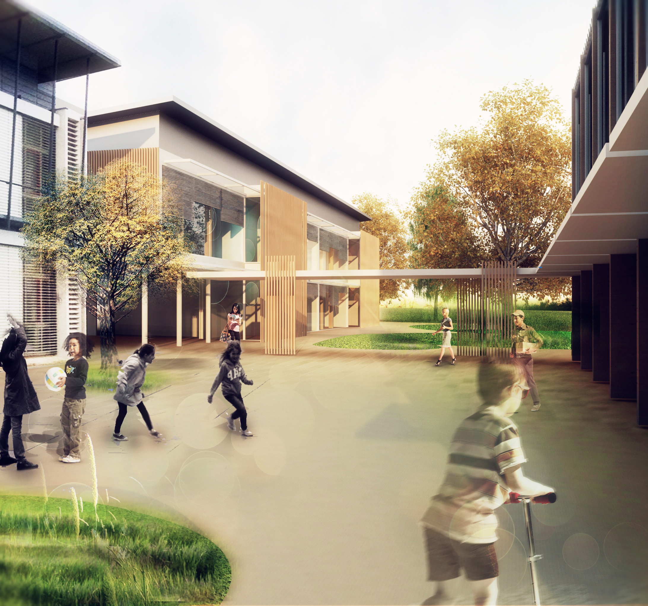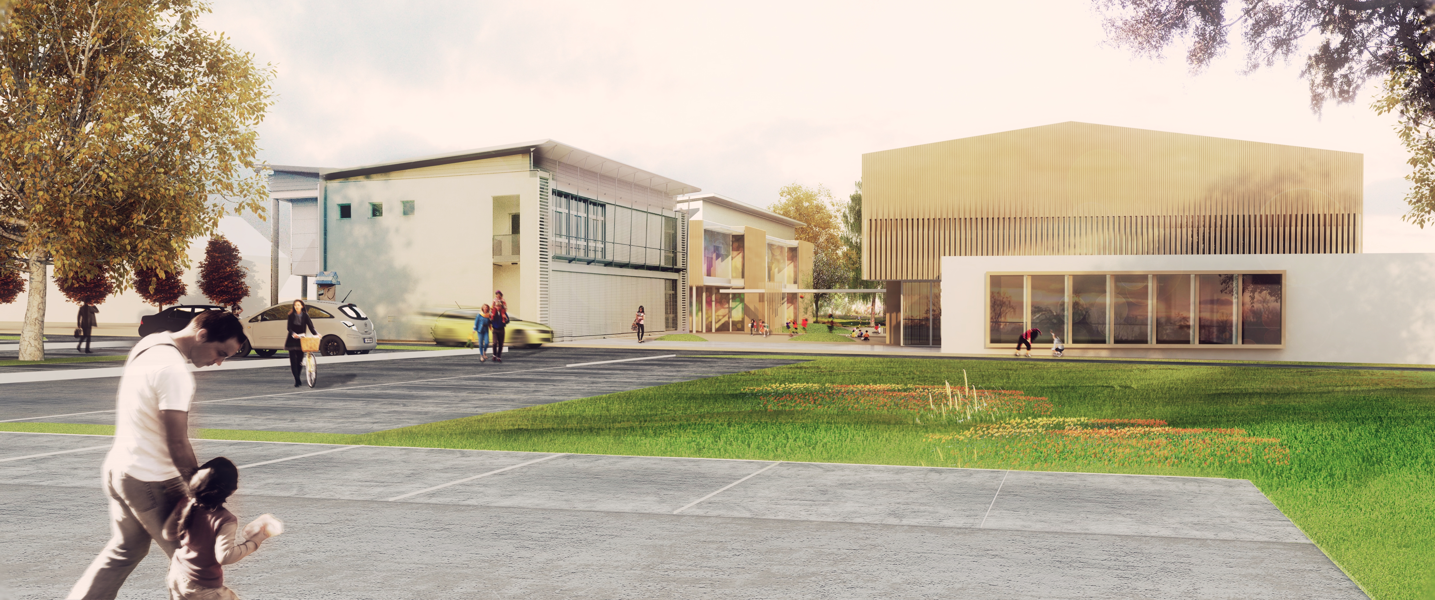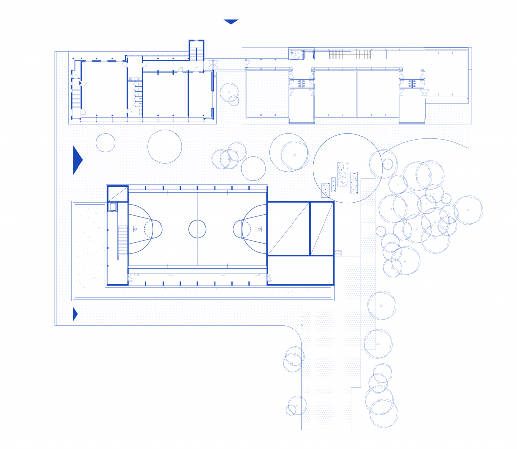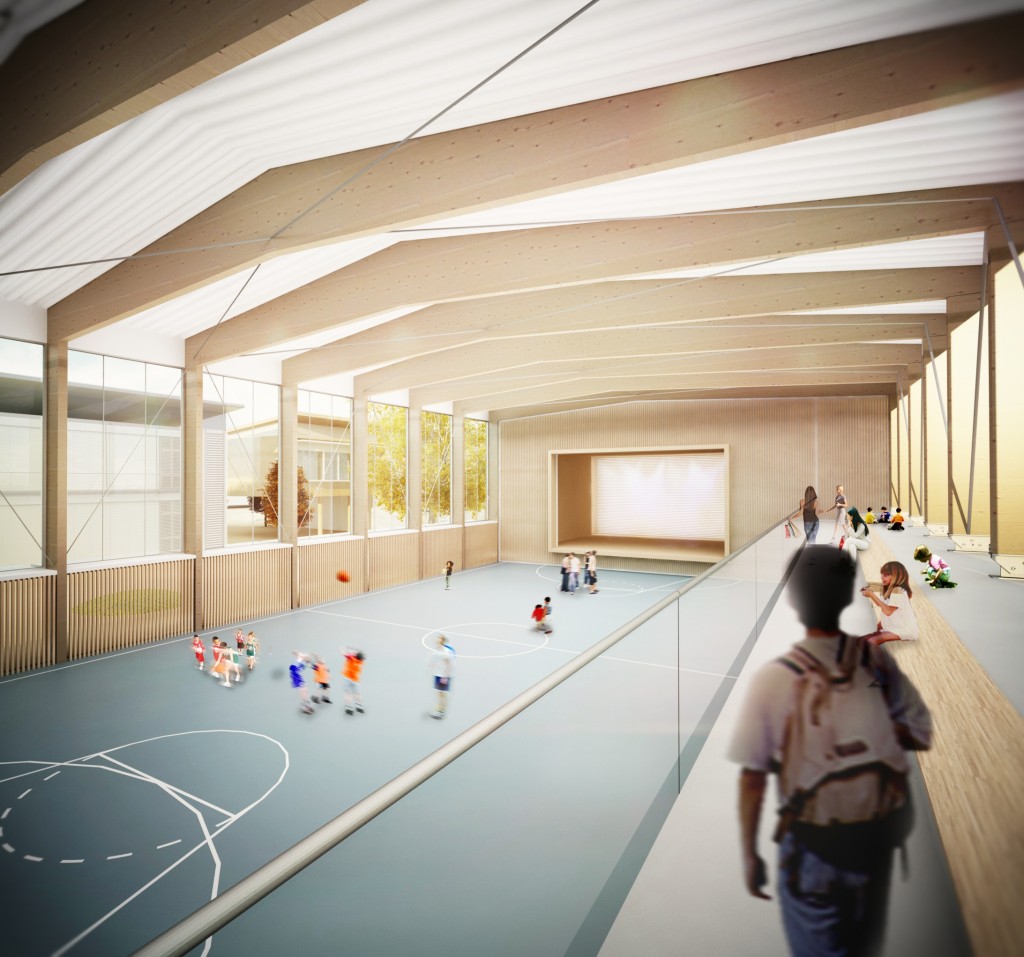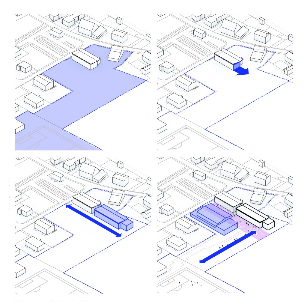Le projet d’agrandissement de l’école s’appuie sur la composition paysagère et urbaine de Gletterens : il identifie un «axe vert» Est-Ouest, parallèle à la rive du lac, comme le prolongement du bois à l’intérieur de la parcelle, puis un «axe minéral» de cheminements Nord-Sud. Les masses bâties du bâtiment existant de l’école, du nouveau bâtiment scolaire dans son prolongement et de la salle polyvalente en face identifient une cour intérieure ouverte, sans frontières, mais qui ne se noie pas pour autant dans l’échelle du territoire..