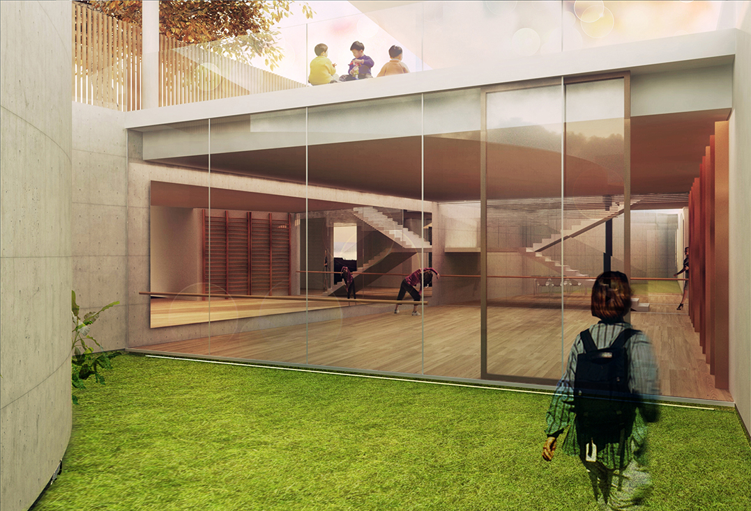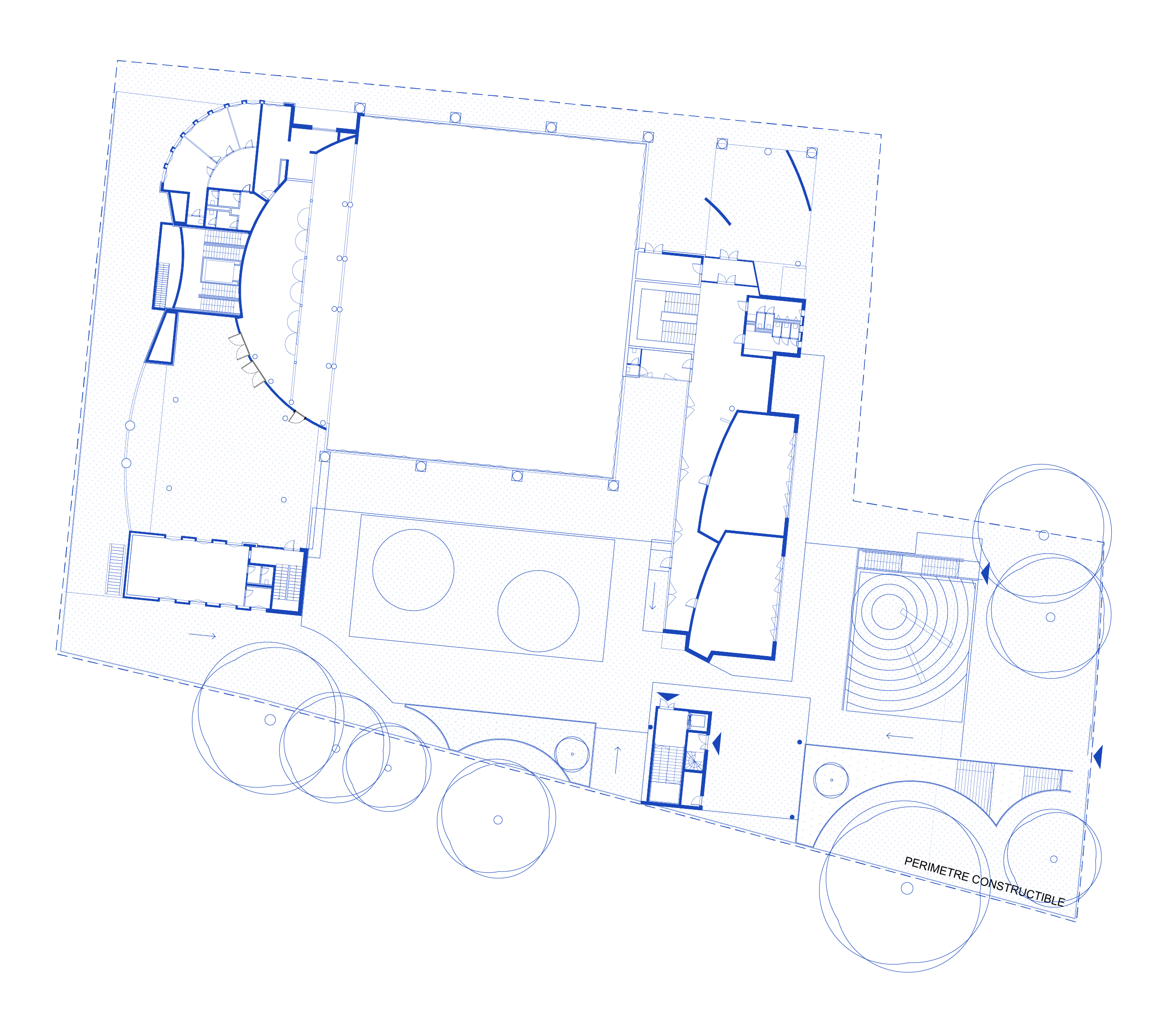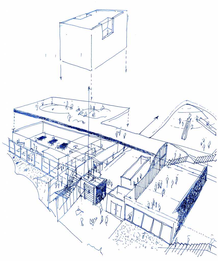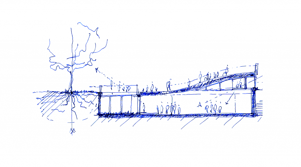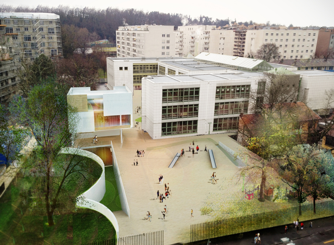 Le projet d’extension du groupe scolaire choisit de s’appuyer sur les infrastructures existantes de l’école tout en s’implantant en sous-sol, libérant ainsi la parcelle à des usages mixtes et multiples (cours de récréation, jardin et place publique). Traiter le projet par le vide efface les frontières fonctionnelles du lieu et ouvre le quartier aux rencontres, aux dialogues et aux synergies.