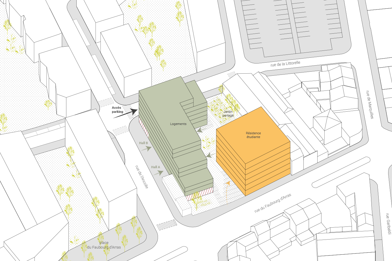 Tout l’enjeu de notre proposition réside dans l’ouverture de la parcelle à son environnement. En effet nous sommes convaincus que la restructuration complète de la parcelle permet d’apporter une meilleure réponse urbaine, environnementale et sociale et donc plus pérenne.