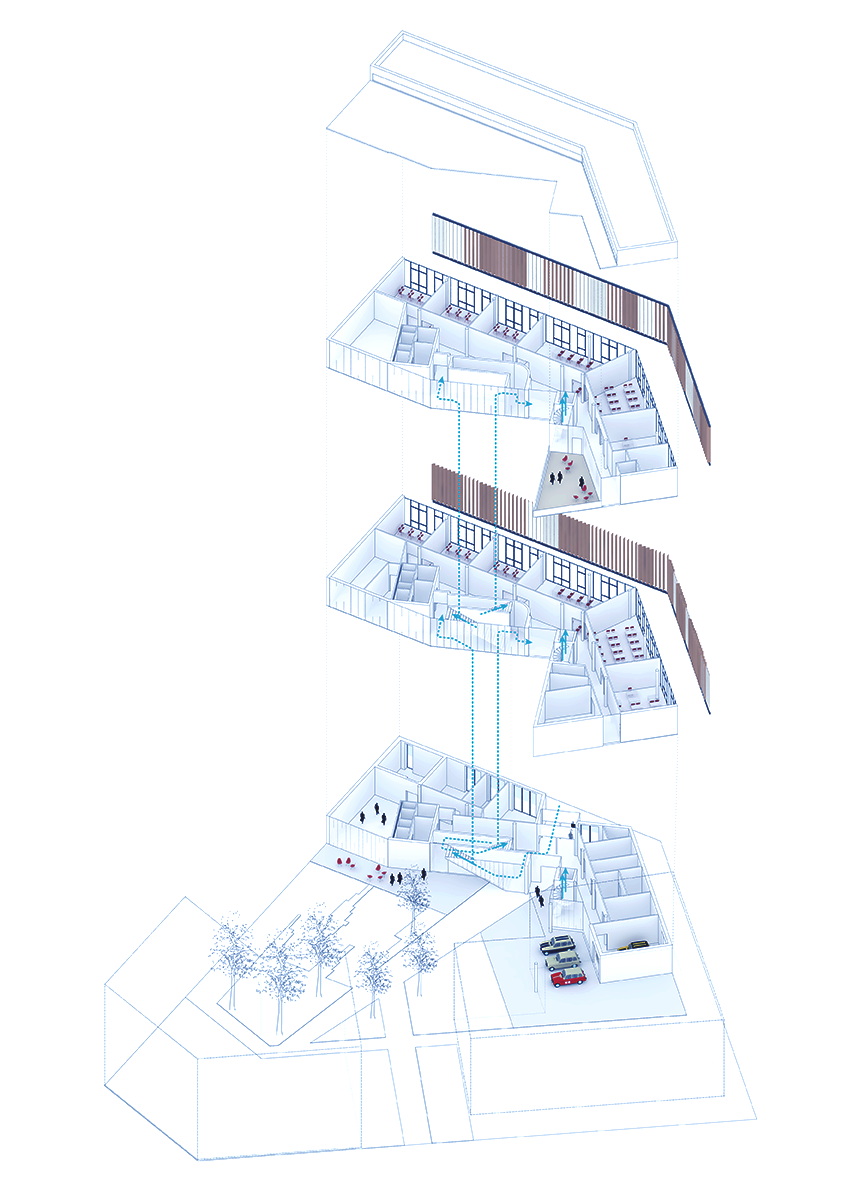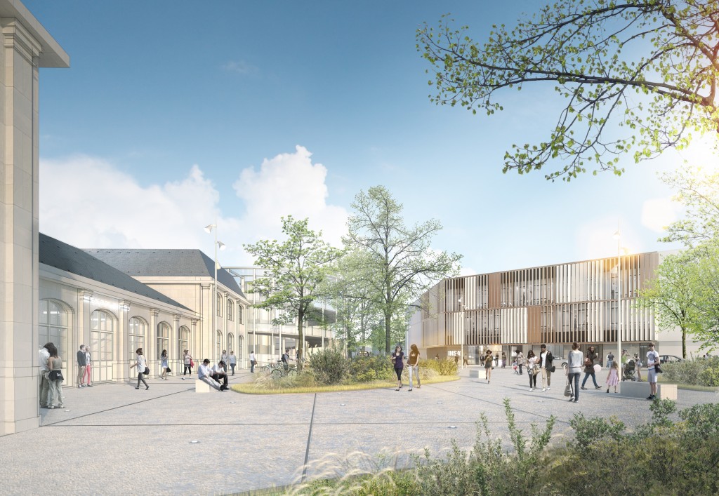Un nouveau bâtiment est implanté sur le parvis de la gare. Il accueille de grands espaces d’enseignement, comme les salles de Travaux Dirigés ou les salles d’informatique, ainsi que des lieux plus spécifiquement consacrés à la vie étudiante, comme une salle de musique, des bureaux associatifs et un atelier dédié à la mécanique. Le projet prévoit aussi la réhabilitation et l’extension du bâti existant, afin de compléter, réorganiser et rendre plus ergonomiques les espaces actuels. Un Learning Center viendra en extension du bâtiment principal, situé côté parvis. Il constituera un outil d’apprentissage ouvert aux étudiants et au monde.