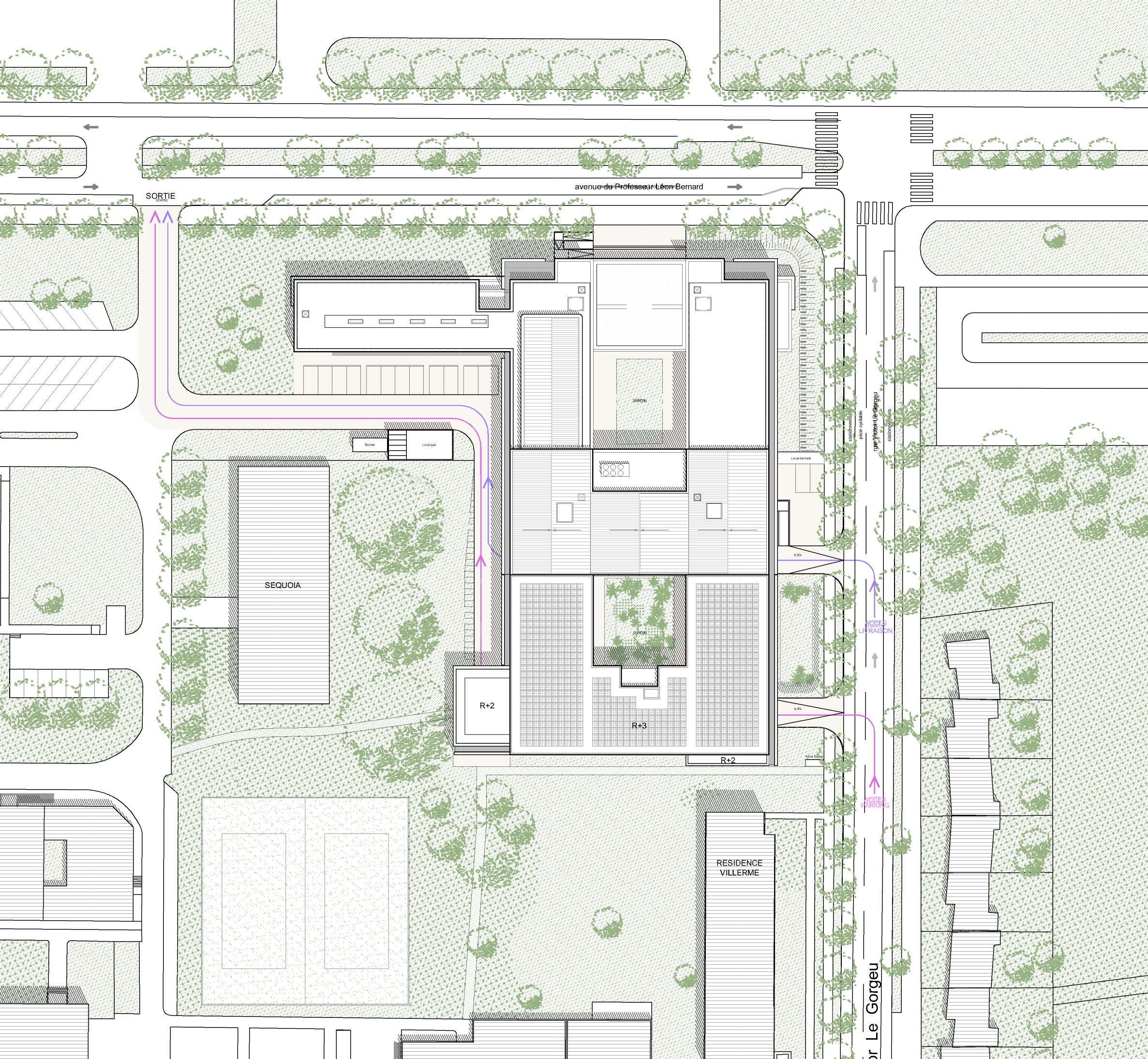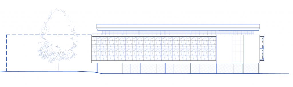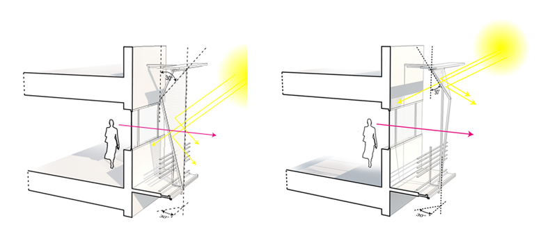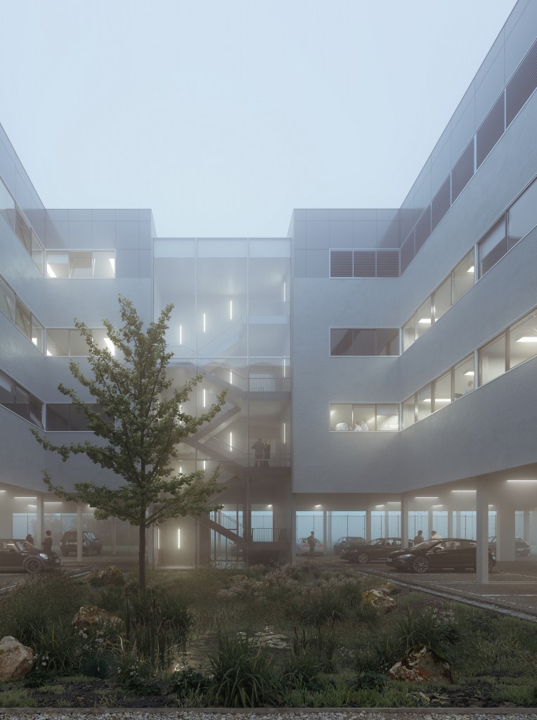 Le caractère contemporain se signale en façade par la présence de protections solaires en avant-plan. Elles ont une forme triangulaire et sont orientables à 30°. Le parking occupe une partie du rez-de-chaussée et est fermé d’une grille en métal déployé. Le hall ouvre sur un patio paysagé, ceint de murs rideaux en aluminium laqué. Les bureaux disposent d’ouvrants pour une ventilation naturelle et les matériaux sont biosourcés.
