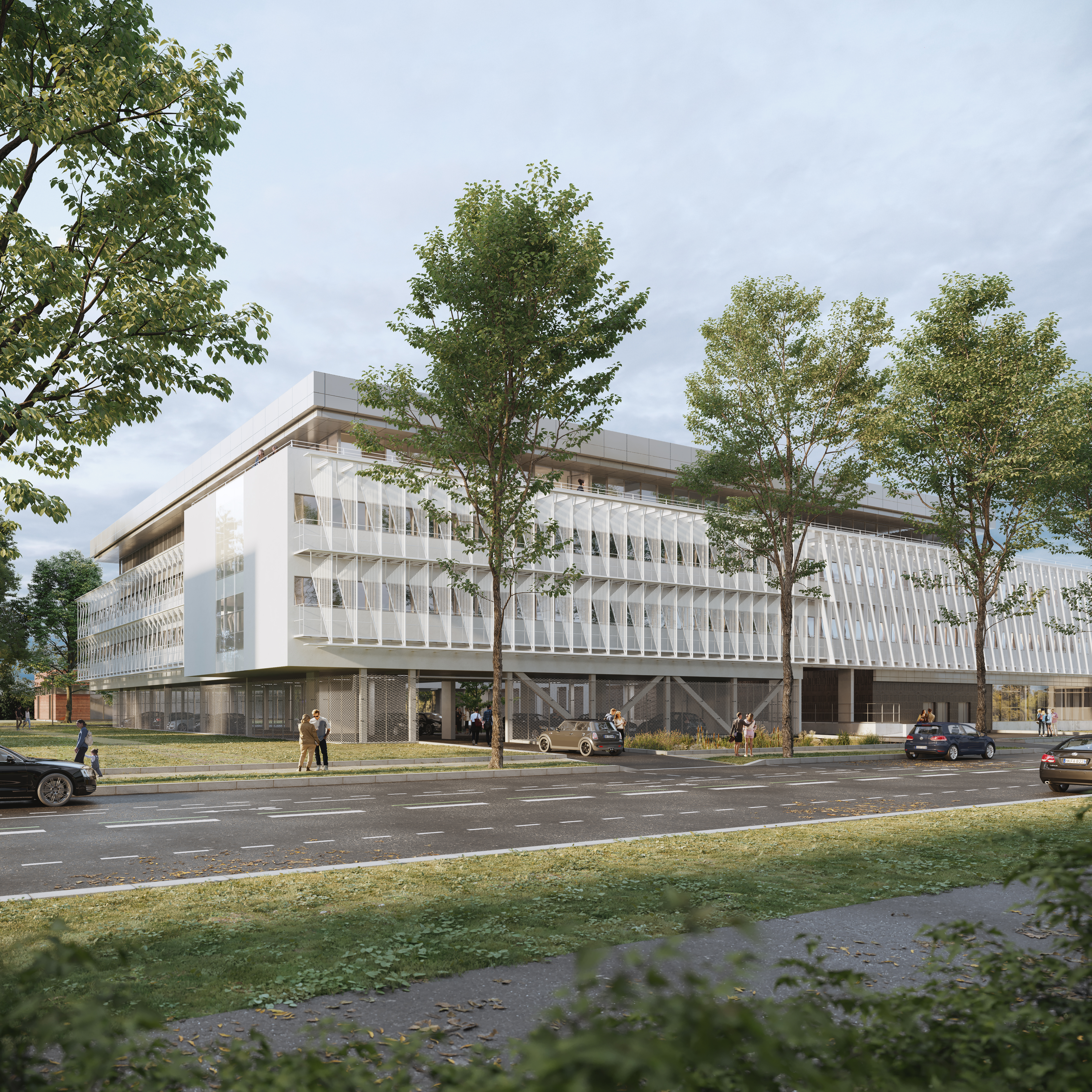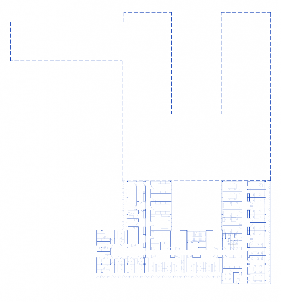 L’opération est une extension d’un bâtiment existant, situé dans un campus très aéré et arboré, construit à la fin des années 1960. Elle s’attache à créer de la cohérence : elle reprend la typologie, les masses et le traitement tramé des façades, et dans les espaces intérieurs implante les circulations en continuité. Elle reprend aussi le meilleur de la production bâtie de cette période, la grande qualité d’éclairement naturel, y compris dans les escaliers. Il abrite des bureaux et des laboratoires.