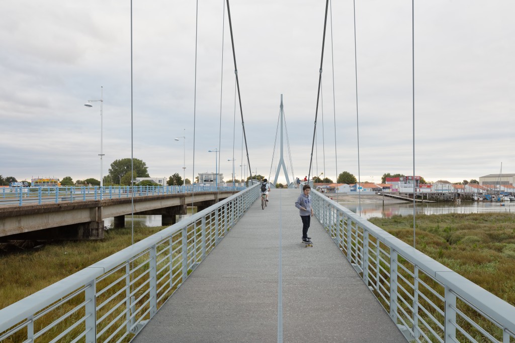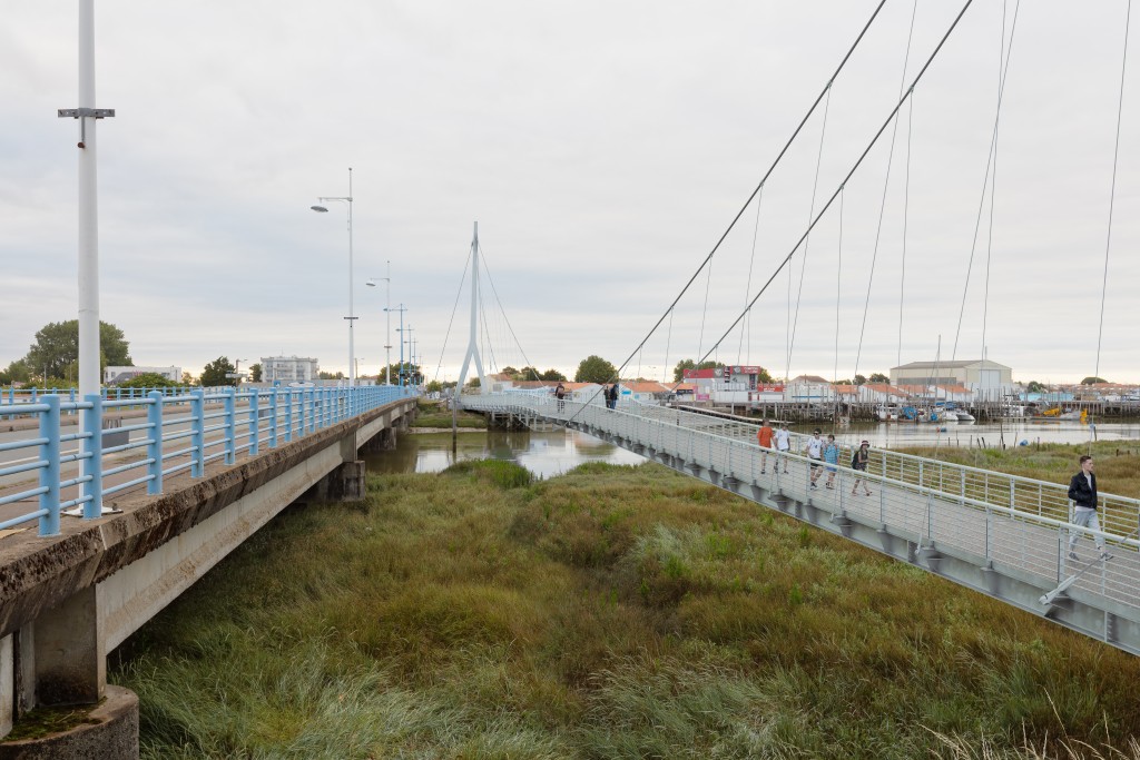 Symbole de l’attachement des deux rives, qui apparait chaque année sur de nombreuses cartes postales depuis sa construction, le pont n’est plus en état d’être rénové et court à sa ruine. Ainsi, de la Région Vendée jusqu’au villes, cinq collectivités ont décidé ensemble de remplacer l’ouvrage existant par une nouvelle passerelle qui sera l’emblème de cette union sur le prochain centenaire. Pour symboliser l’unicité de cette commune qui se constitue, nous proposons une passerelle symétrique dans sa forme : son axe, au-dessus du Lay, sera la partie la plus large (6m) et accueillera pêcheurs et promeneurs. De part et d’autre, le tablier se déploie sur une largeur qui permet aux piétons et aux cycles (3m) de co-circuler, entre deux pylônes identiques qui prennent appui sur la digue de la Faute-sur-Mer et le port de l’Aiguillon-sur-Mer.