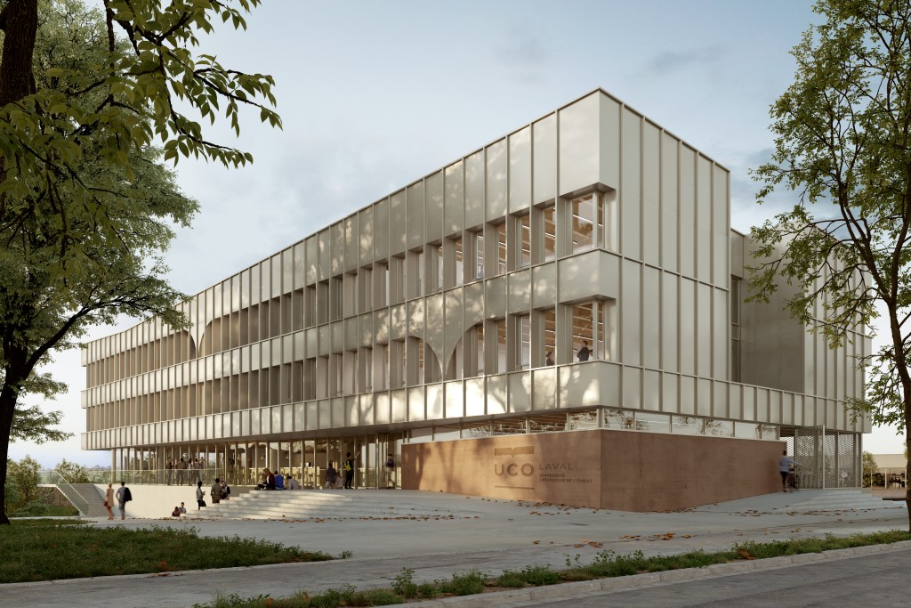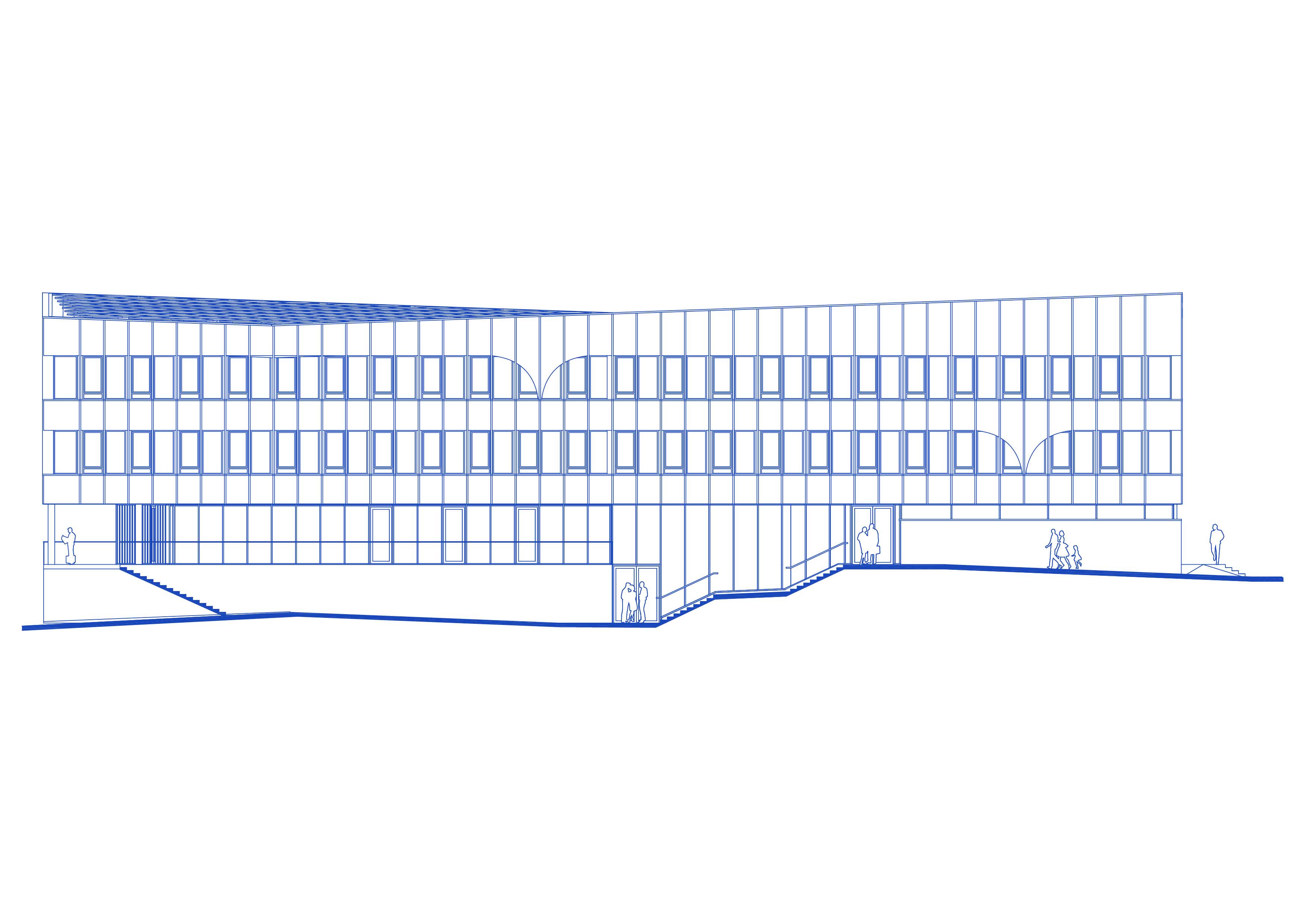 L’accès au bâtiment se fait par deux entrées situées face au parc-jardin, sur un parvis remarquable décliné sur plusieurs niveaux, lesquels sont reliés par un jeu d’emmarchement, respectant le dénivelé naturel du terrain.
