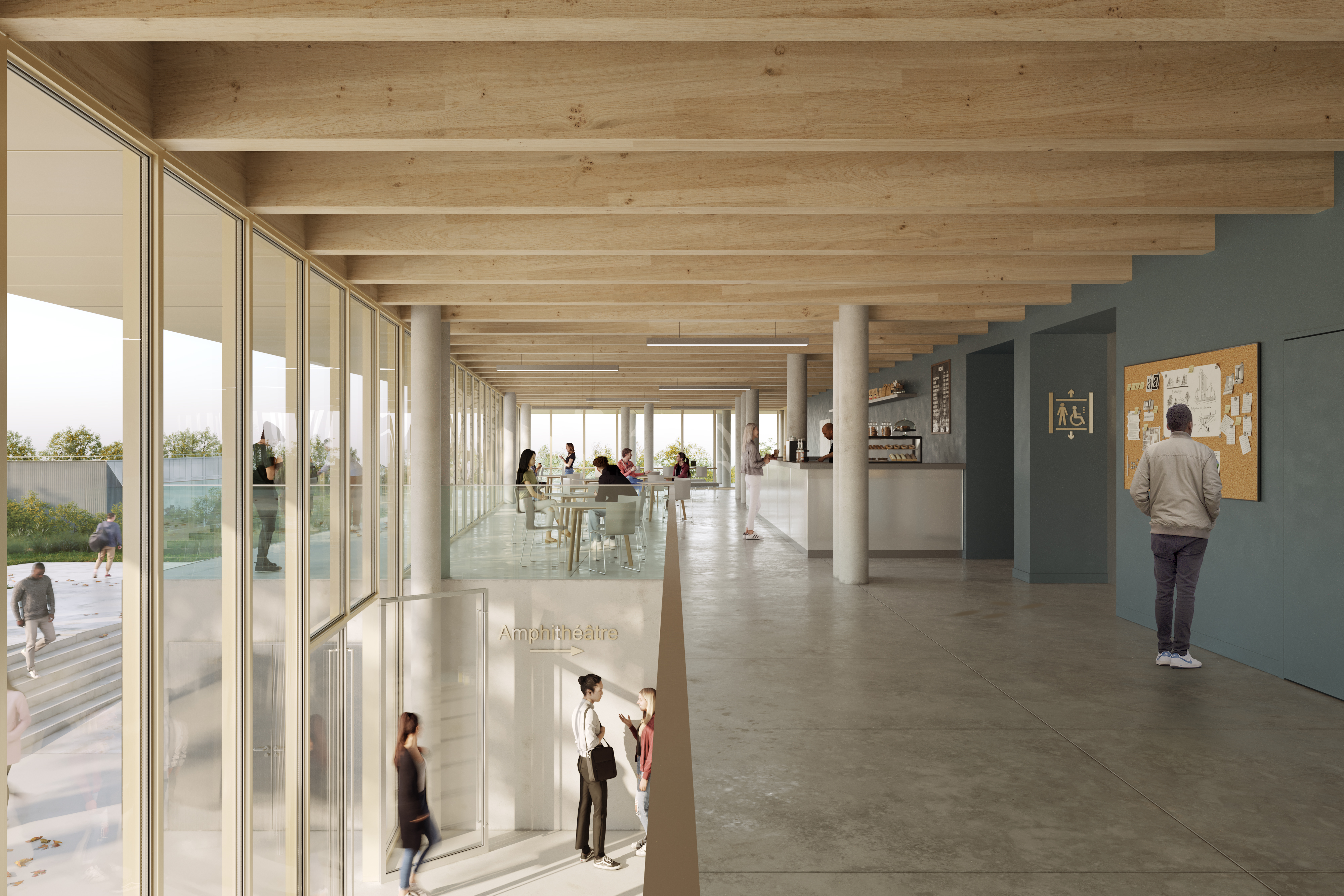 L’établissement scolaire est conçu tel un « Pavillon », devant lequel s’ouvre un espace végétal préservé, qui aura vocation, comme le bâtiment en lui-même, à devenir un lieu d’échange et de convivialité. Le bâtiment et le parc sont appréhendés de façon globale, l’espace de verdure étant partie intégrante à la conception du bâtiment, tel un amphithéâtre naturel qui se reflète dans la façade imprégnée de lumière.